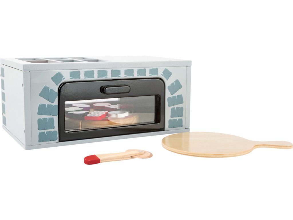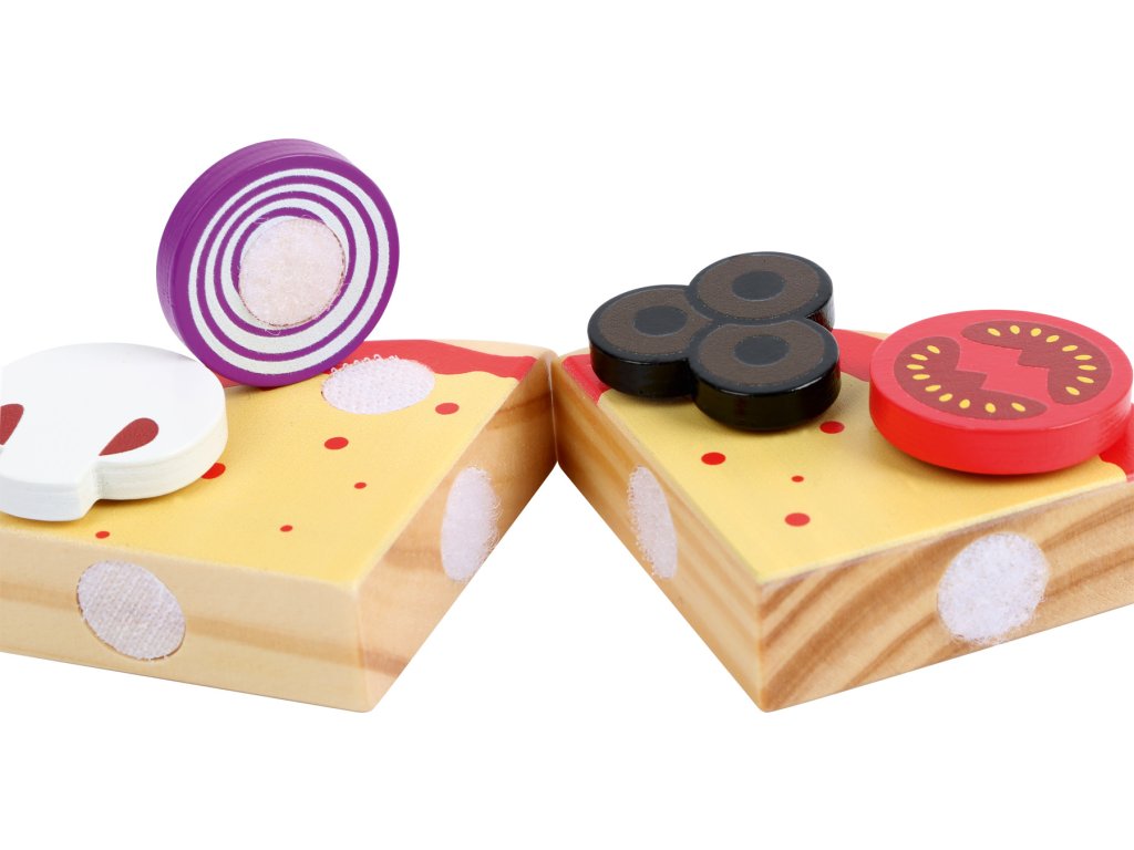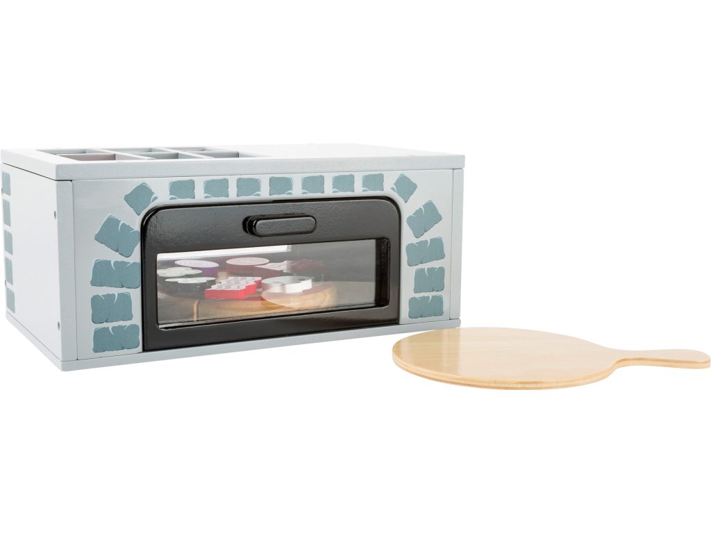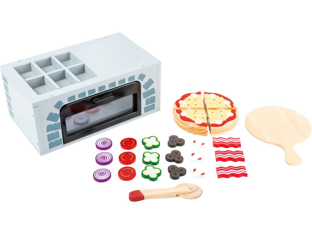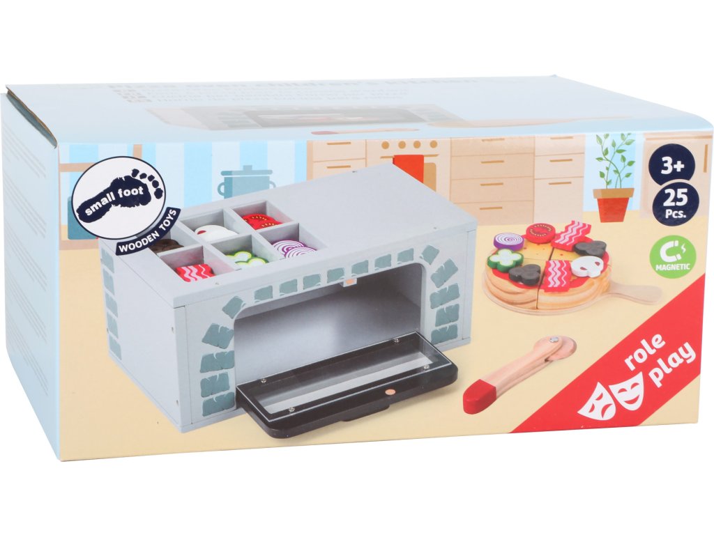 Pečení pizzy jako pro dospělé! Malí pekaři si zde mohou upéct vlastní pizzu a díky suchým zipům si ji také dle vlastní chuti vyzdobit (cibule, houby, rajčata, okurky, slanina, olivy). Dřevěná pizza lopatka ji vloží do pece, kterou lze otevírat a zavírat pohyblivými dvířky. Přílohy jsou uloženy v přehledných přihrádkách v horní části pece. Po upečení stačí pizzu kráječem rozdělit na čtyři stejné díly. Kdo další dostává hlad? Hlavní vlastnosti: otvíratelná dvířka peceingredience na pizzu spojeny suchým zipemtrénuje motorikupodporuje aktivní hraní rolí a rozvoj sociálních dovedností při hřeSizing info