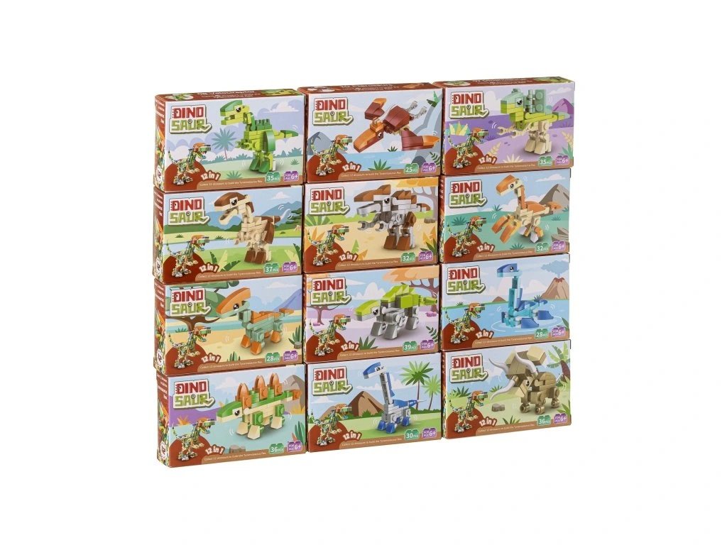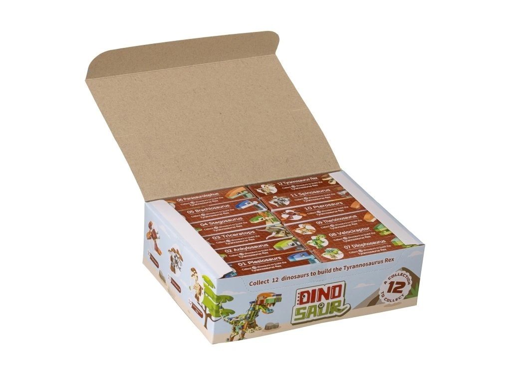 Kolekce 12 ks dinosaurů. Poskládejte si 12 malých dinosaurů anebo si z nich rovnou složte velkého Tyranosaura rexe. Pro složení T-rexe musí být k dispozici všechny kostičky z boxu. Z důvodu velkého množství specifických dílků je stavebnice vhodná spíše pro větší děti. Každý dinosaurus je balen v samostatné papírové krabici. Kostičky jsou v plastikovém obalu s návodem. Na návodu je vždy na jedné straně návod ke složení dinosaura z krabičky a na druhé straně je pak část návodu pro složení Tyranosaura rexe. Hlavní vlastnosti: kombinováním sady malých dinosaurů lze sestavit velký model Tyranosura rexeideální jako box pro pravidelné odměňování dětíSizing info