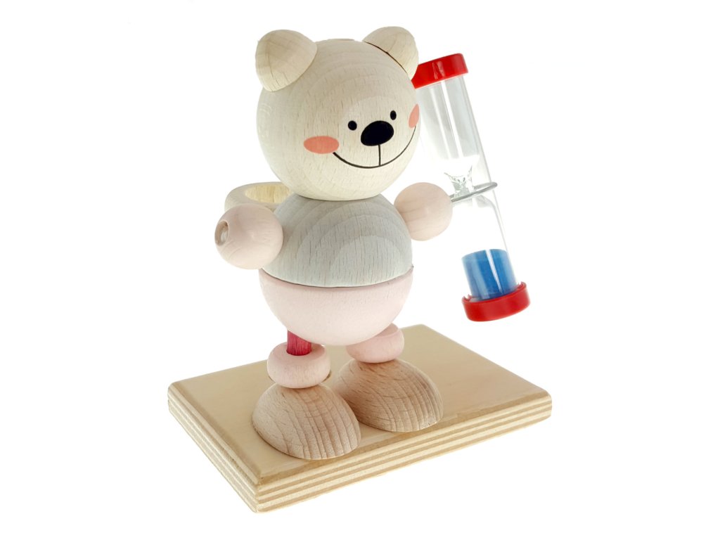 Roztomilý medvídek s úsměvem pohlídá kartáček i dobu, po kterou si děti čistí zoubky. Za zády je opatřen kroužkem, kde lze uložit kartáček, a s jeho přesýpacími hodinami pak děti hravě naučíte, jak dodržovat zdravé návyky. Pevná dřevěná konstrukce a robustní plastové tělo hodin zaručují maximální bezpečnost používání. Všechny součásti využívají nezávadných materiálů a barev. Vyrobeno v Německu, s použitím dřeva z německých lesů. Hlavní vlastnosti:atraktivní designdoba přesýpání 2 minutyrobustní a odolné provedeníSizing info