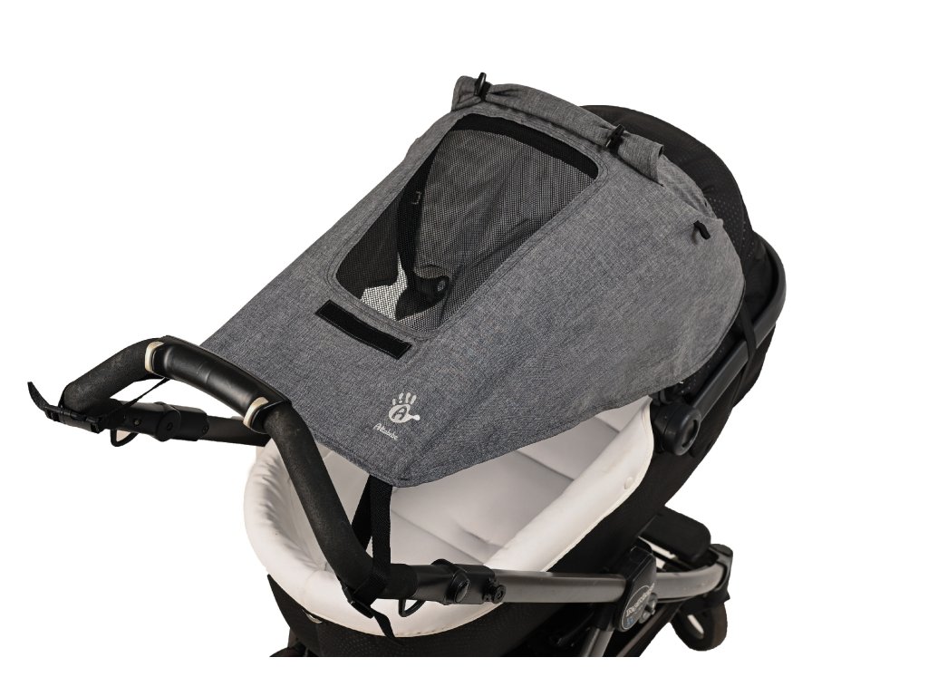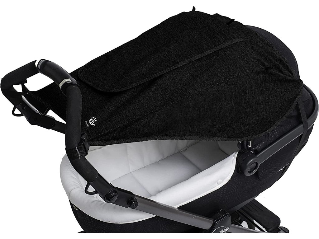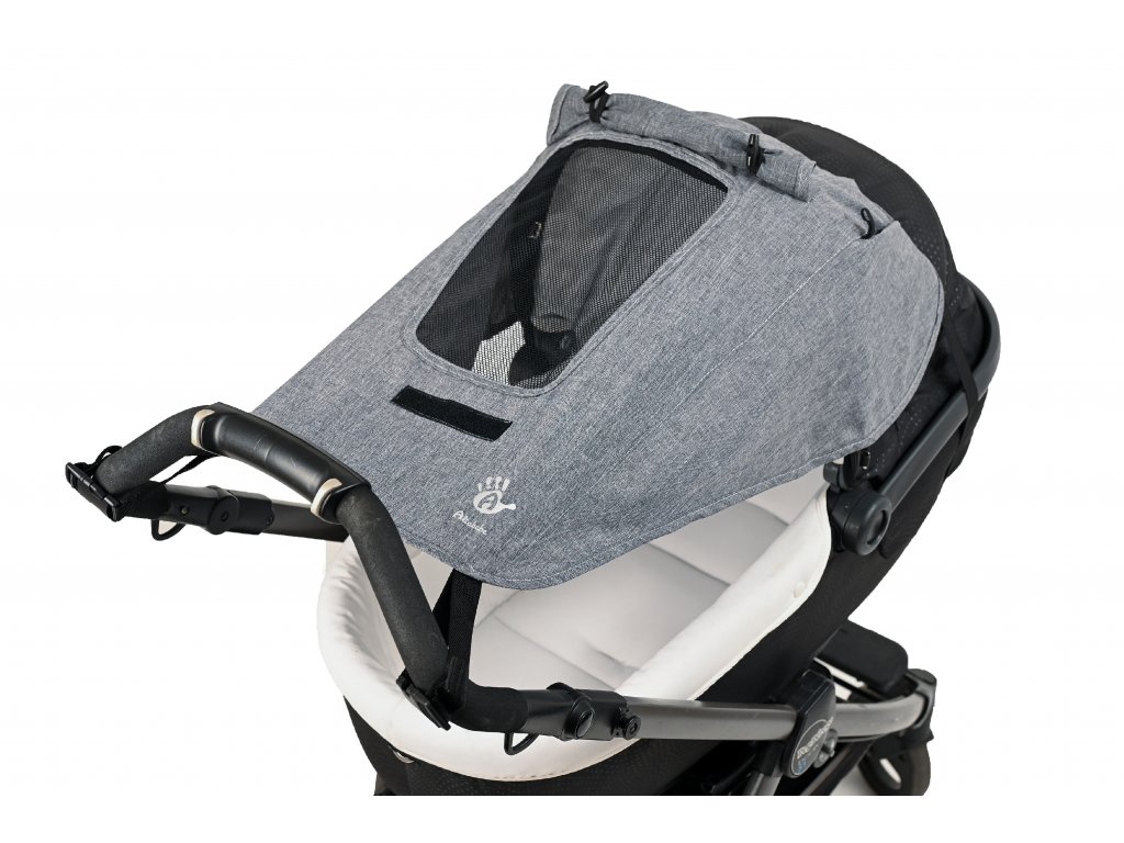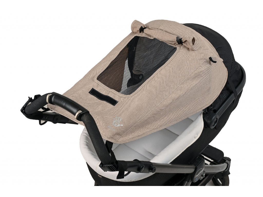 - Komfortní! Lze jednoduše upevnit: na rukojeť kočárku pomocí šňůry a na střeše gumovým páskem a pevně drží i při silném větru.