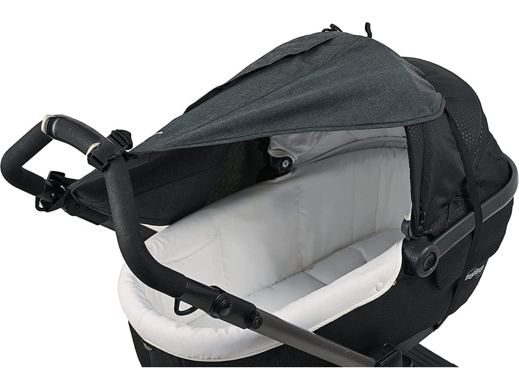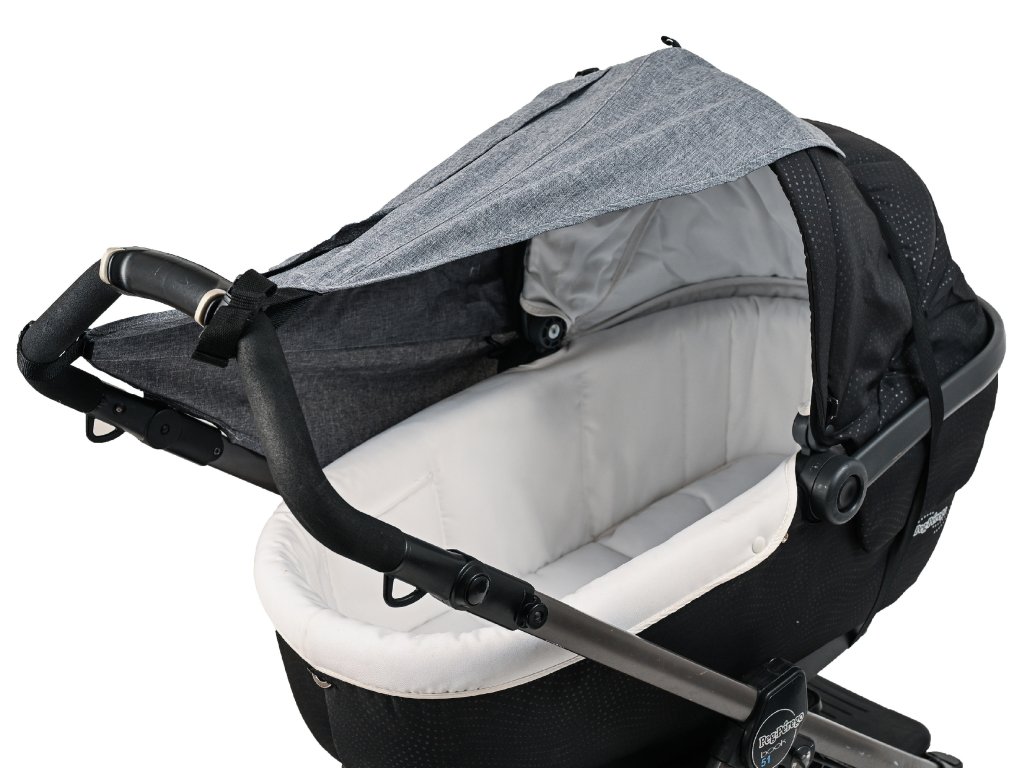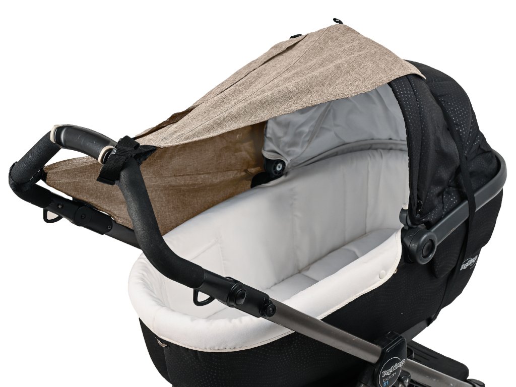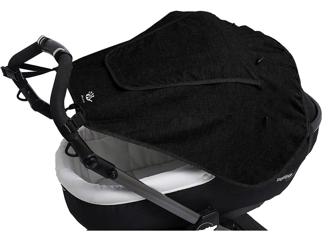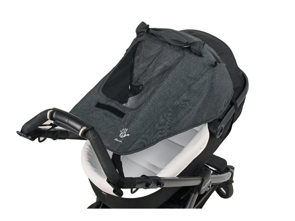 - Komfortní! Lze jednoduše upevnit: na rukojeť kočárku pomocí šňůry a na střeše gumovým páskem a pevně drží i při silném větru.