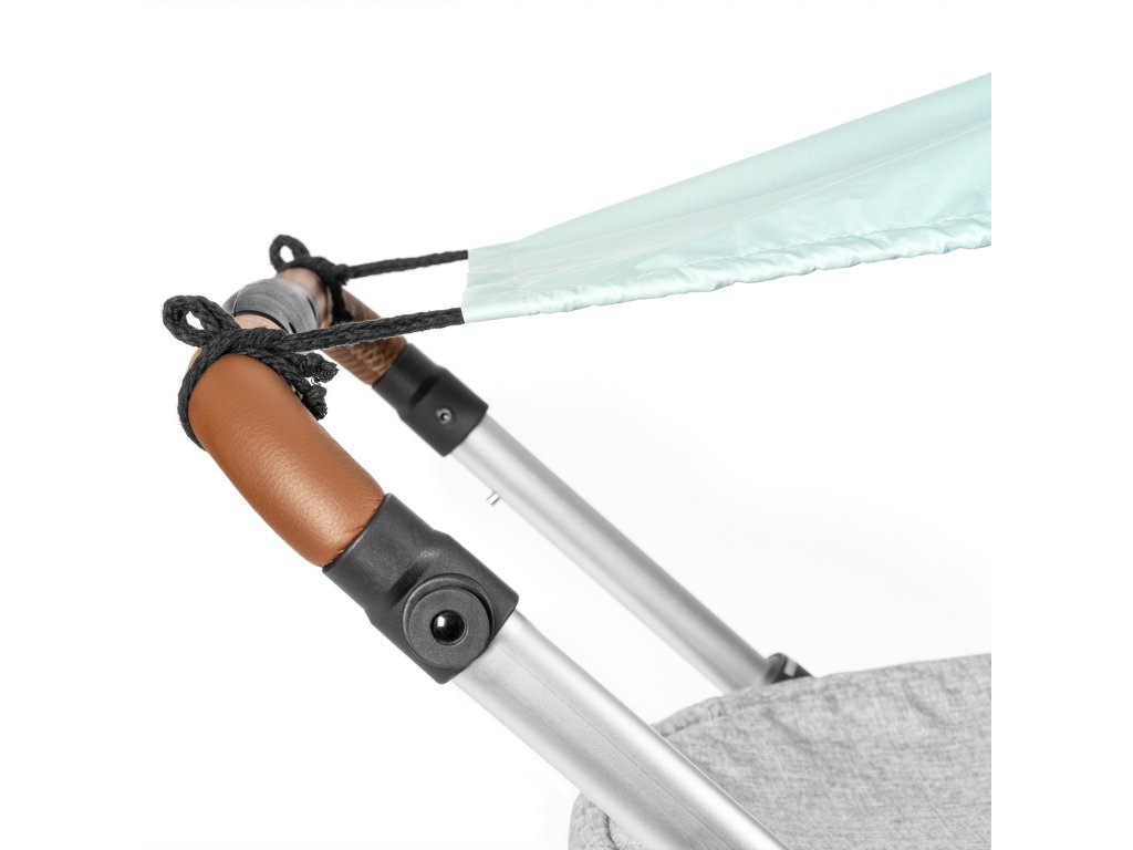 Když se plachta nepoužívá, je stažena dozadu jako roleta; není nutné ji z kočárku sundávat.