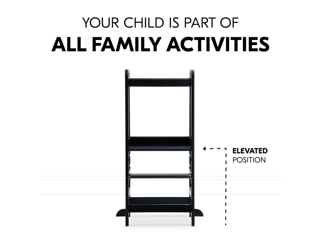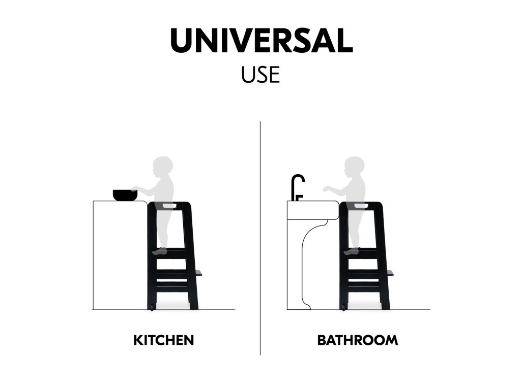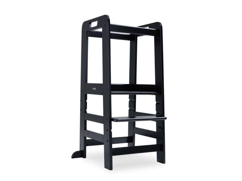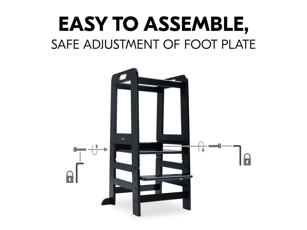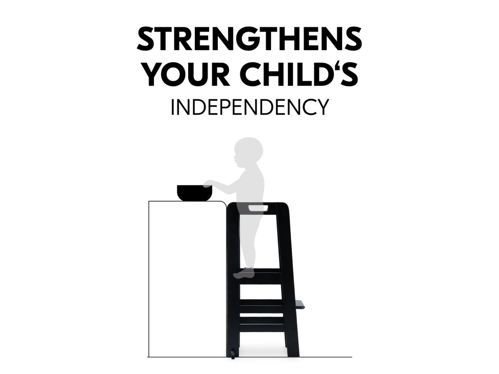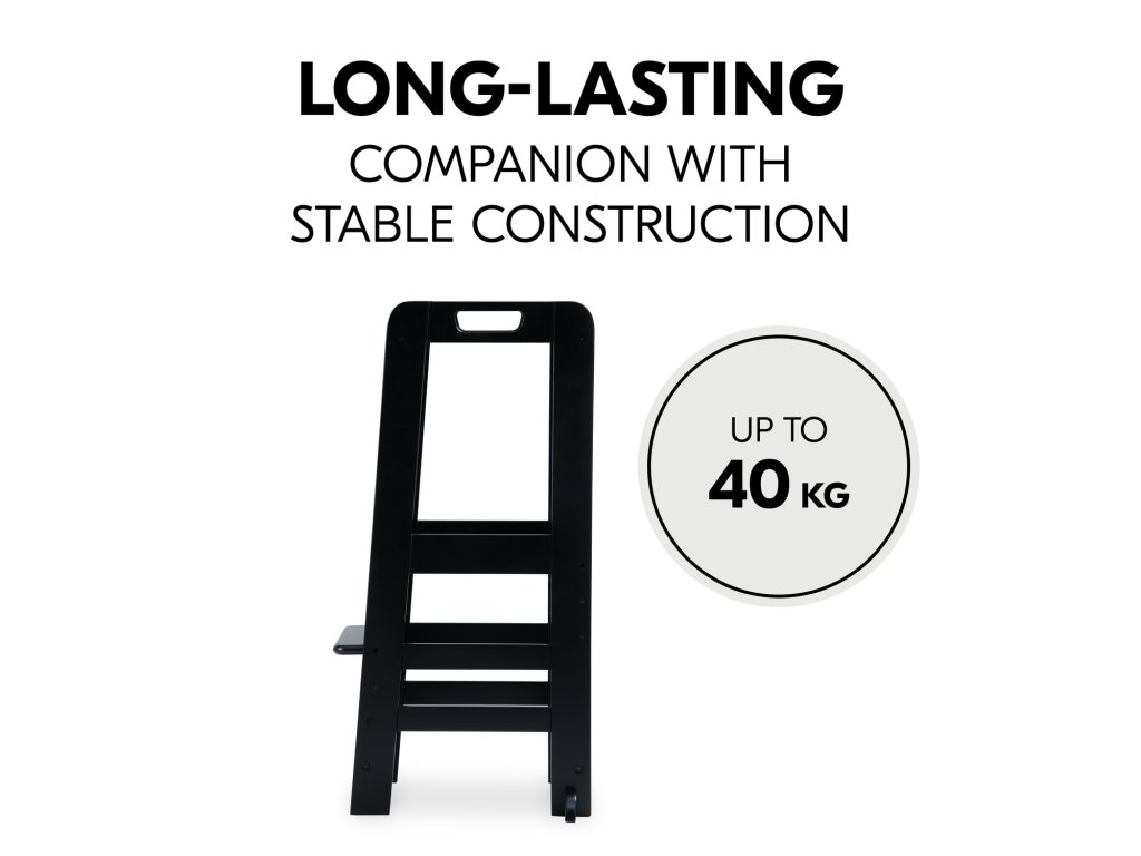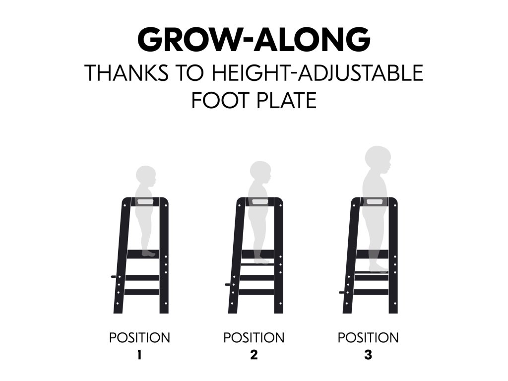 V závislosti na velikosti vašeho dítěte můžete nastavit nožní desku kuchyňského pomocníka do tří různých výšek. Robustní a stabilní konstrukce umožňuje vašemu dítěti používat Montessori věž až do hmotnosti 40 kg, ať už v kuchyni, u jídelního stolu nebo u umyvadla v koupelně.