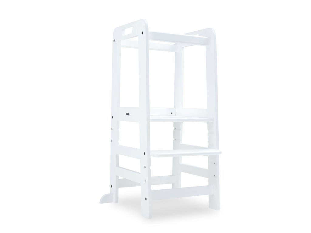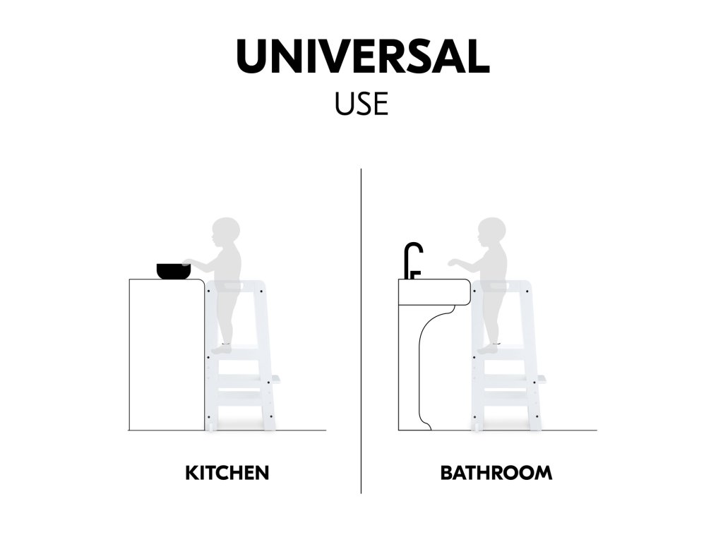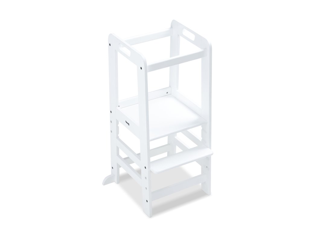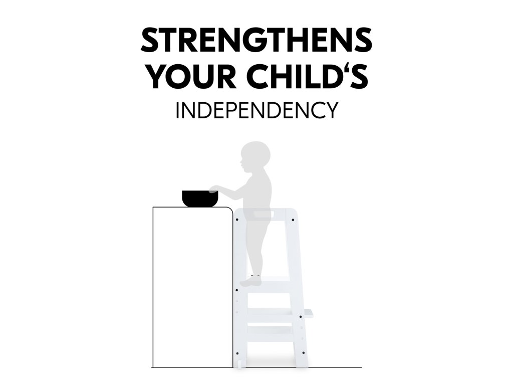 V závislosti na velikosti vašeho dítěte můžete nastavit nožní desku kuchyňského pomocníka do tří různých výšek. Robustní a stabilní konstrukce umožňuje vašemu dítěti používat Montessori věž až do hmotnosti 40 kg, ať už v kuchyni, u jídelního stolu nebo u umyvadla v koupelně.