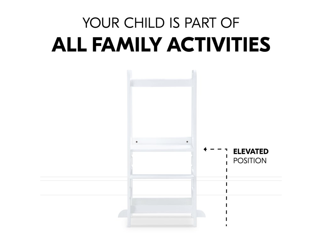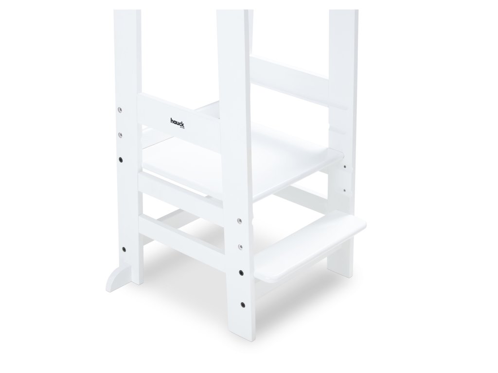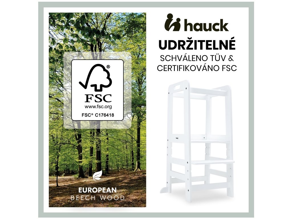 Díky vyvýšené poloze stupínku se může vaše dítě zapojit do běžných rodinných aktivit a pomáhat vám, bezpečně ve výšce očí. V duchu Montessori "Pomoz mi, abych to dokázal sám" se vaše dítě od útlého věku zapojuje formou hry, např. do vaření nebo pečení, a posiluje tak svou samostatnost, jazykový a sociální rozvoj i sebevědomí. Učící Věž pro batolata hauck má certifikát FSC®, což znamená, že bukové dřevo pochází z lesů s certifikátem FSC a šetrným lesním hospodářstvím.