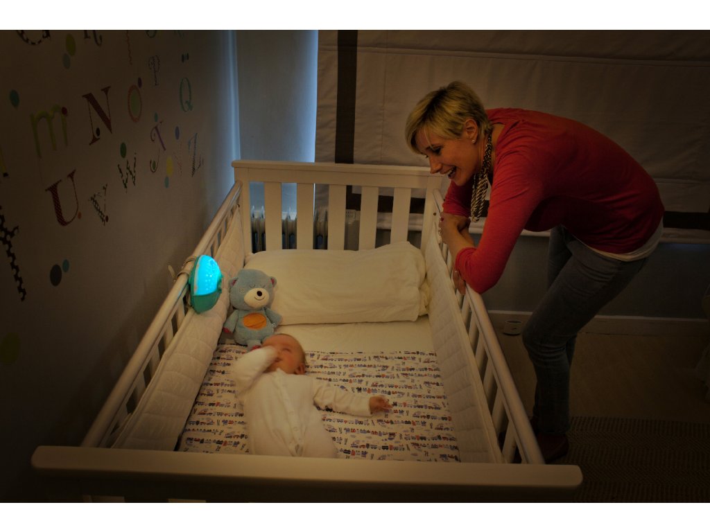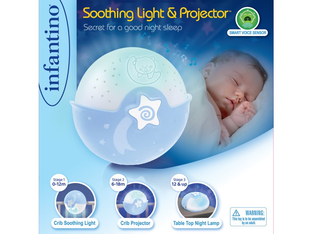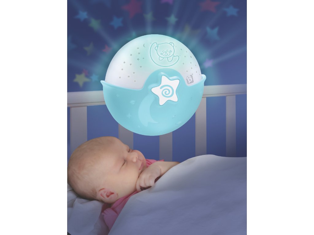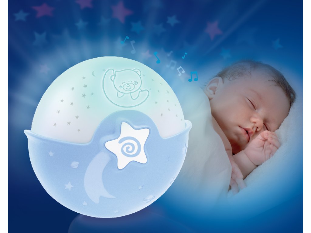Noční lampička s hudbou a světelným projektorem pro klidné usínání vašeho dítěte. Lampička promítá na stěnu či strop hvězdičky a jemně tak osvítí dětský pokoj. Lampička nabízí 6 něžných melodií a 3 varianty zvuků přírody s automatickým vypnutím po 10 minutách. Pokud se dítě v noci probudí, senzor zvuku aktivuje uklidňující jemné světlo. Lampička s projekcí může být připevněna na dětskou postýlku nebo postavena na noční stolek. Baterie 3xAA nejsou součástí. Vhodné pro děti od narození.Doplňkové parametry