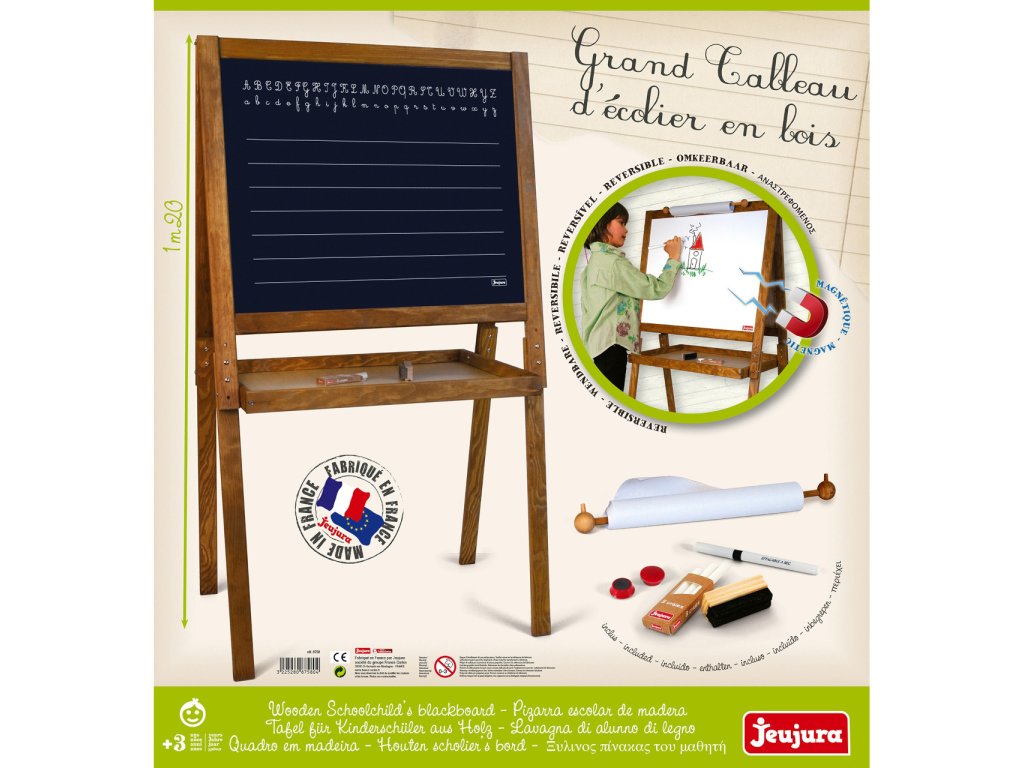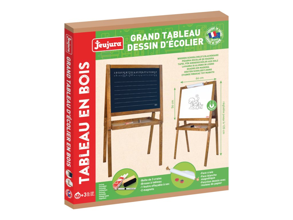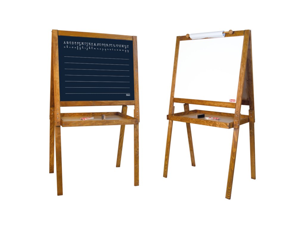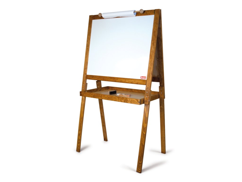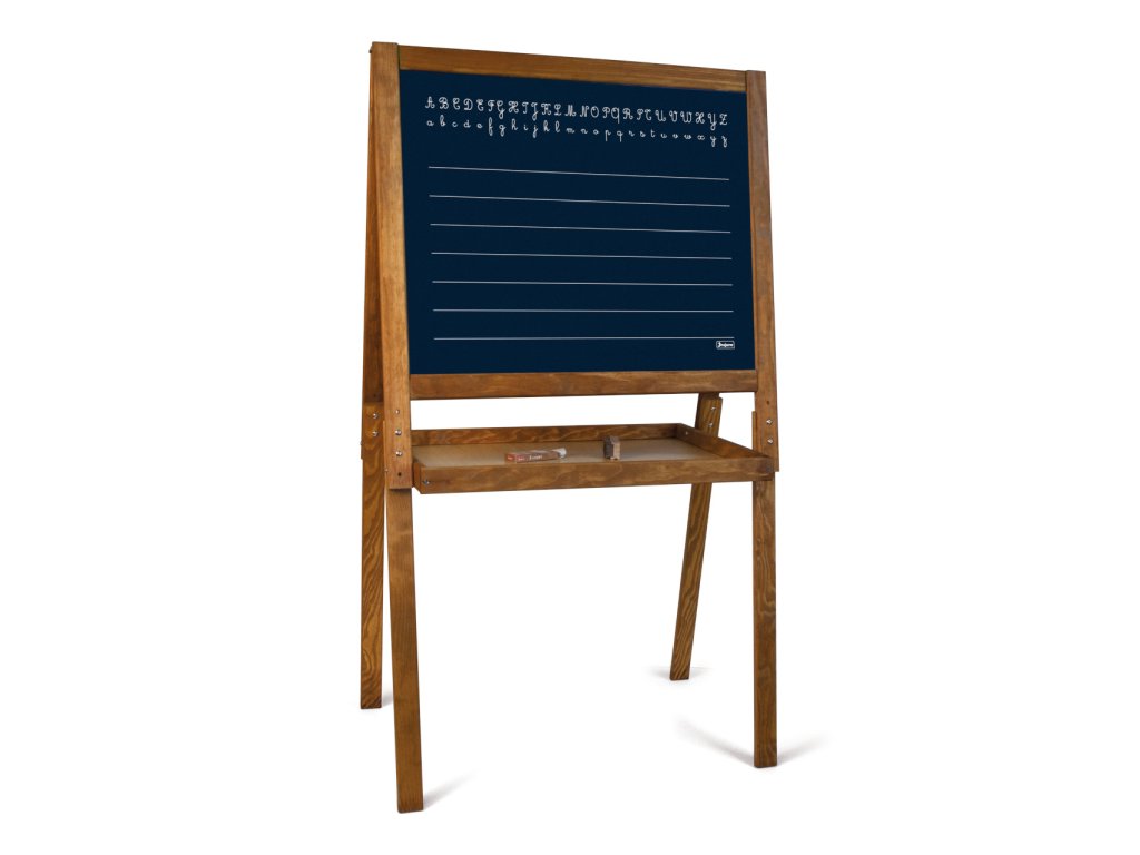 Dvojice tabulí na rozkročené dřevěné konstrukci s nastavitelnou výškou, vybavené velkým odkládacím či úložným prostorem. Na černou tabuli se píše a kreslí křídou, bílou tabuli lze popisovat zvlášť určenými fixy a mazat plstěnou houbičkou. Černá tabule je linkovaná a obsahuje vzory psacích písmen pro snadné učení. Součástí výbavy je také držák na role papíru. Vyrobeno ve Francii, z masivního bukového a borovicového dřeva francouzského původu. Součásti jsou ošetřeny výhradně za použití barev a laků na bázi vody. Baleno v kartonu potištěném rostlinnými inkousty. Součástí balení jsou křídy, fix, houbička, magnety a 1 role papíru. Hlavní vlastnosti: tabule, 3 křídy, fix, houbička, 2 magnety a role papírurozměry tabule 66x54 cmpro křídy/magnetická pro fixylinkování, vzory písmadržák pro papírové rolevelký odkládací prostorvýškově stavitelná 115–120 cmvyrobeno ve FranciiSizing info