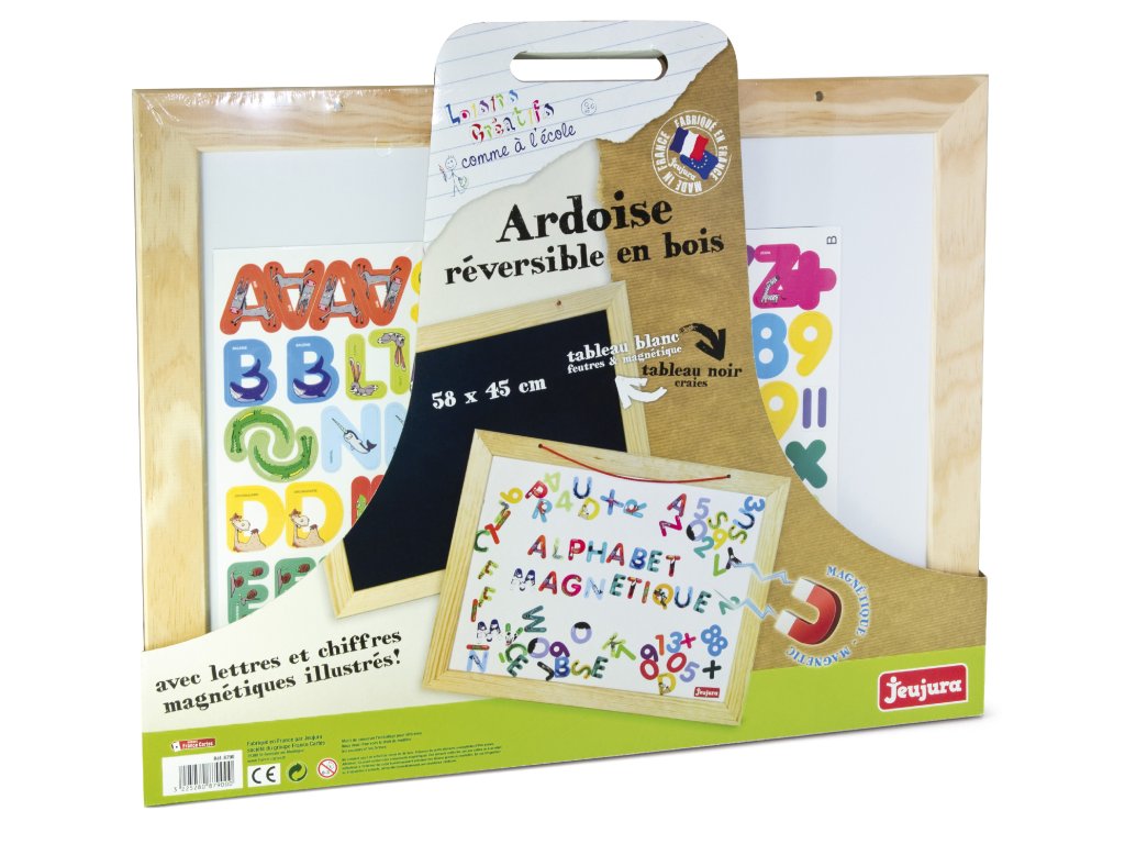 Závěsná oboustranná magnetická tabule. Na černou tabuli se píše a kreslí křídou, bílou tabuli lze popisovat zvlášť určenými fixy a mazat plstěnou houbičkou. Vyrobeno ve Francii, z masivního bukového a borovicového dřeva francouzského původu. Součásti jsou ošetřeny výhradně za použití barev a laků na bázi vody. Baleno v kartonu potištěném rostlinnými inkousty. Součástí balení je sada vzorovaných magnetických písmen. Hlavní vlastnosti:tabule a sada magnetických písmenrozměry tabule 58x45 cmoboustranná pro křídy/fixy, magnetickávyrobeno ve FranciiSizing info