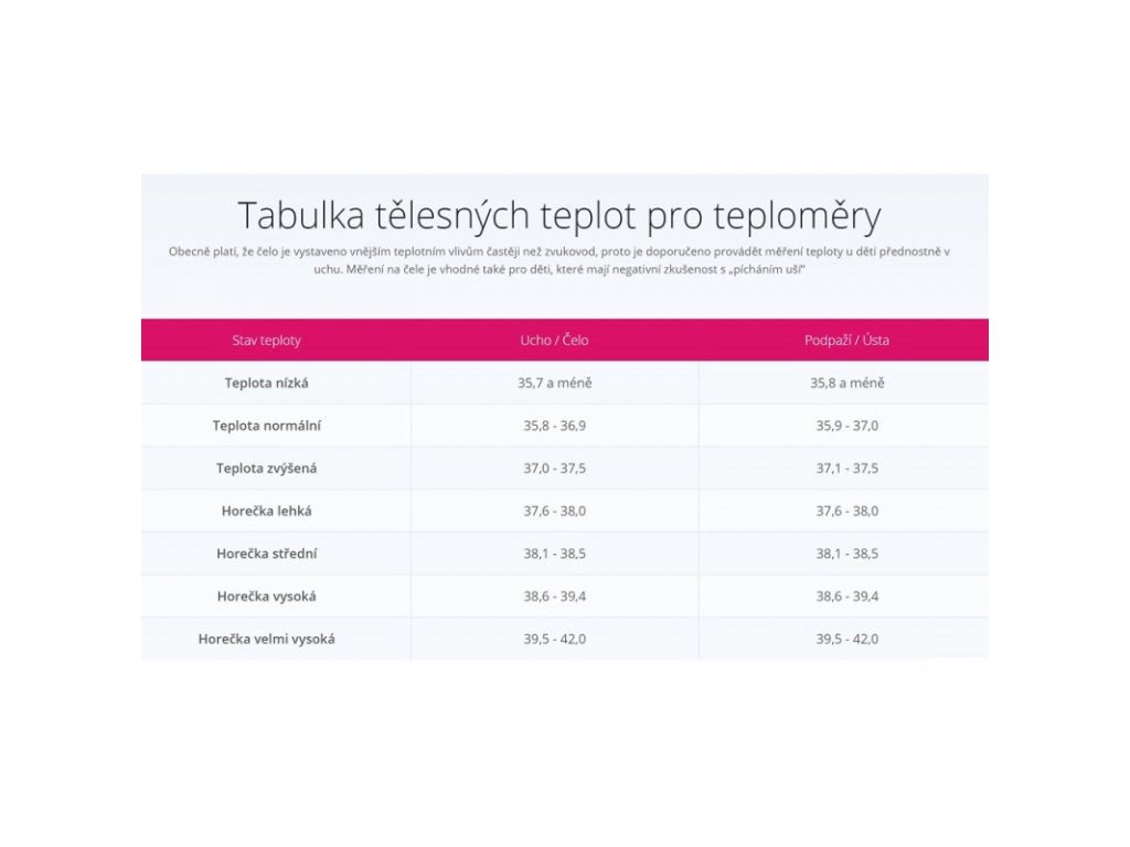 - Teplota naměřená na čele se mírně liší od teploty v podpaží nebo ústech (bývá o 0,1 stupně nižší).