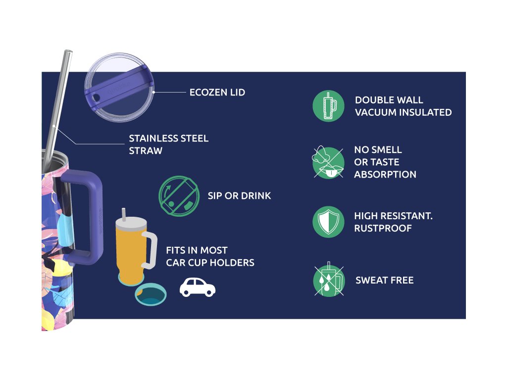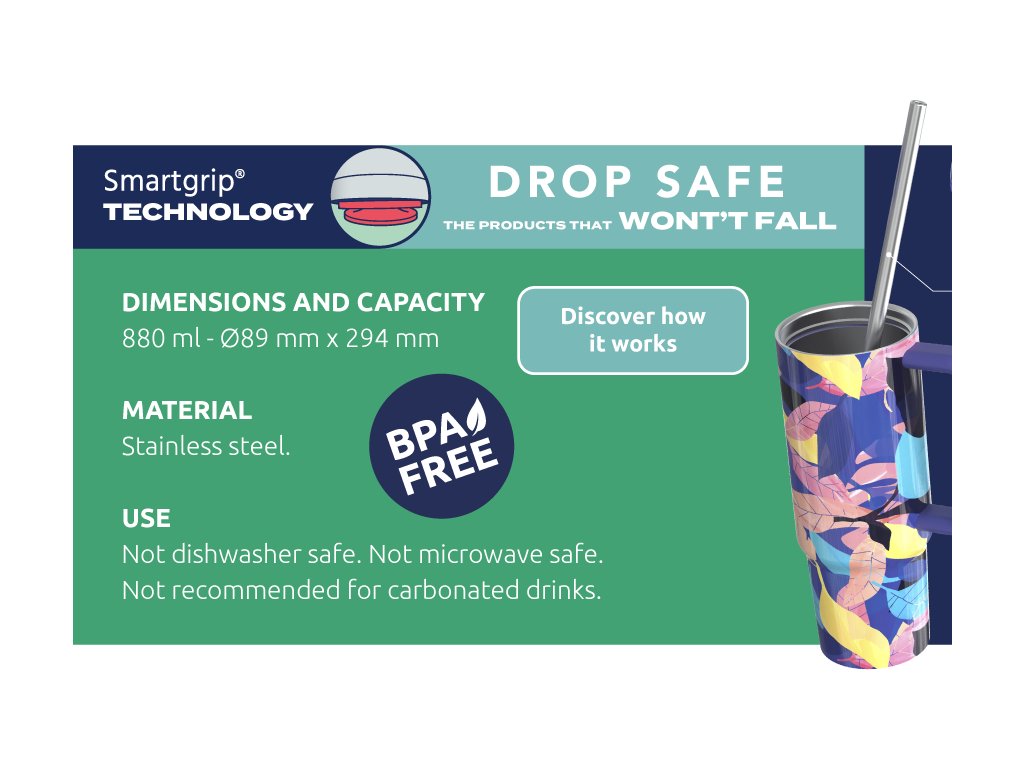 Termohrnek Quokka Vibe z vysoce kvalitní dvoustěnné oceli udrží teplotu nápoje studeného s ledem až 48 hodin, studeného až 14 hodin a teplého až 8 hodin. Termohrnek s vyjímatelným nerezovým brčkem umožňuje snadné pití bez nutnosti naklánění. Spolehlivý uzávěr z kvalitního Ecozen plastu chrání obsah před vylitím a umožňuje z termohrnku pít i bez brčka. Široké hrdlo umožňuje vložení kostek ledu a zároveň se díky němu hrnek snadno čistí. Quokka Vibe je součástí kolekce hrnků Drop Safe se speciálním dnem Smartgrip®, které při postavení na hladký povrch brání převržení a nechtěnému vylití obsahu hrnku. Tvar termohrnku je vhodný do většiny držáků nápojů v autě. Objem: 880 ml Rozměry: 294 x 89 mm Nerezový materiál neabsorbuje pachy a neobsahuje BPA. Termohrnek není vhodný do myčky ani mikrovlnné trouby.Doplňkové parametry