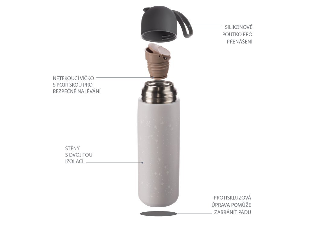 Díky vakuové izolaci se termoska při naplnění horkou tekutinou nezahřívá z venku. K pohodlnému uchopení je termoska vybavená silikonovým držákem nápoje.