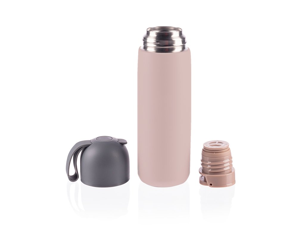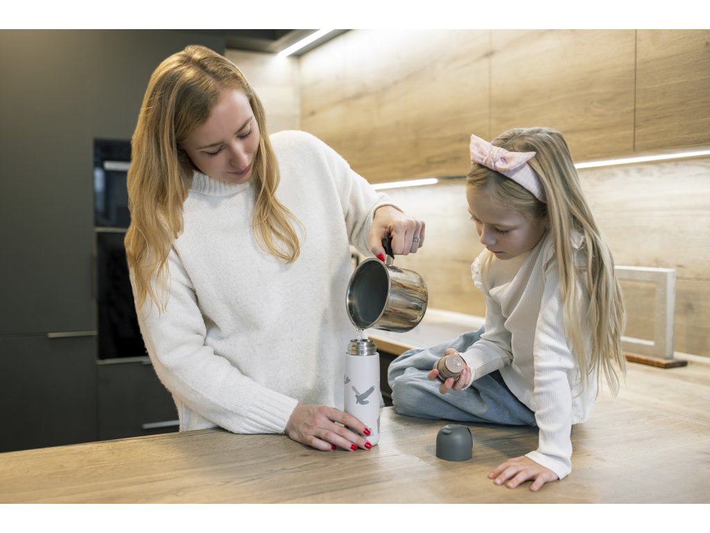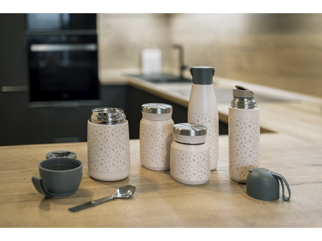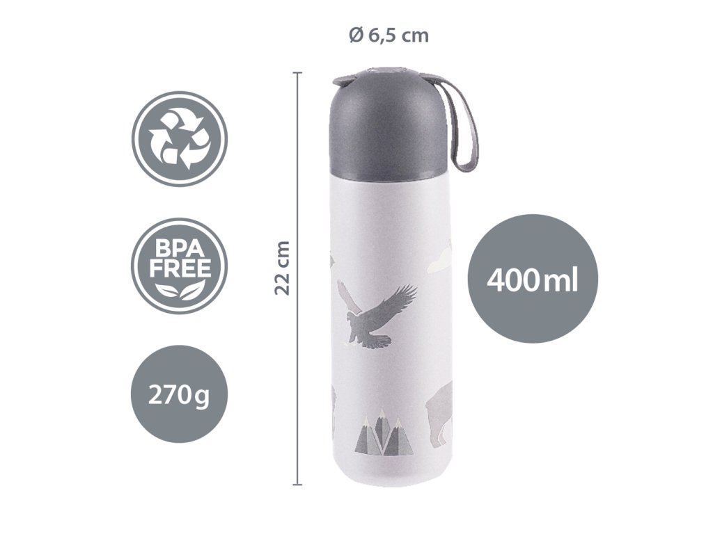 Kvalitní termoska na tekutiny o objemu 400 ml uchovává horké nápoje až 12 hodin, studené až po dobu 24 hodin. Je vyrobena z kvalitní nerezové oceli, která je odolná vůči korozi. Těsné víčko zajišťuje, že termoska neprotéká a vrchní uzávěr pro pohodlné nalévání se postará o to, abyste se nepolili ani při jízdě autem na nerovné cestě, taktéž si můžete být jisti, že se dítě neopaří tekutinou z termosky vzhledem ke dvojitému uzávěru. Víčko termosky lze použít jako hrníček.