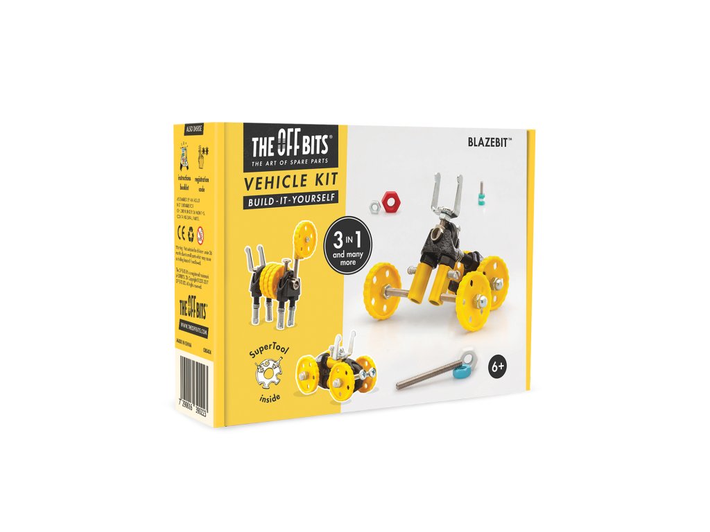 Zahřejte motor, je čas jít! BlazeBit je perfektní vozidlo s pohonem 4 kola pro vašeho robota Offbits. Díky sortimentu koleček a chytrých konektorů vybavíte svého robota na dobrodružství ve velkém stylu. Popusťte uzdu své fantazii. Tato sada umožňuje vytvoření tří modelů s dalšími nekonečnými možnostmi pro vaše vlastní kreativní nápady. Jedná se o hračku, která pomáhá mladým lidem růst v oblastech vědy, technologie, inženýrství, umění a matematiky. Hračky OffBits také podporují rozvoj jemné motoriky, prostorové představivosti, řešení problémů a nápadité hry. Co můžete postavit:BlazeBit, MotorBit, AnimalBit plus nekonečné množství jedinečných výtvorů, které můžete postavit pomocí své fantazie. Máte kolem sebe karton, šroubky nebo jiné zábavné materiály? Vylepšujte s předměty každodenní potřeby a vytvořte také své vlastní jedinečné vynálezy. Hlavní vlastnosti: obsahuje nářadí pro sestavení stavebnicekompatibilnost s každodenními předmětyrozvoj kreativity, jemné motoriky i logického myšlenívhodné od šesti let3 v 1 Ilustrační foto balení:Sizing info