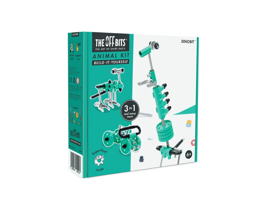 Od hlavy k ocasu! DinoBit je milovník historie. Díky sortimentu barevných matic, šroubů a tvarovaných kousků je tento dinosaurus nelítostně loajální. Popusťte uzdu své fantazii. Tato sada umožňuje vytvoření tří modelů s dalšími nekonečnými možnostmi pro vaše vlastní kreativní nápady. Jedná se o hračku, která pomáhá mladým lidem růst v oblastech vědy, technologie, inženýrství, umění a matematiky. Hračky OffBits také podporují rozvoj jemné motoriky, prostorové představivosti, řešení problémů a nápadité hry. Co můžete postavit:DinosauraBit, dinosauří mláděBit, autoBit 4x4 plus nekonečné množství jedinečných výtvorů, které můžete postavit pomocí své fantazie. Máte kolem sebe karton, šroubky nebo jiné zábavné materiály? Vylepšujte s předměty každodenní potřeby a vytvořte také své vlastní jedinečné vynálezy. Hlavní vlastnosti: obsahuje nářadí pro sestavení stavebnicekompatibilnost s každodenními předmětyrozvoj kreativity, jemné motoriky i logického myšlenívhodné od šesti let3 v 1 Ilustrační foto balení:Sizing info