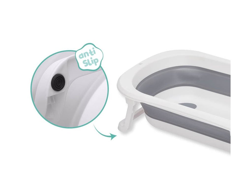 Skládací vanička je velmi praktická díky inovativnímu skládacímu mechanismu. Díky tomu se snadno složí a také rychle znovu použije. S ukazatelem teploty ve vypouštěcí zátce můžete na první pohled vidět, zda je voda ještě příliš horká změnou barvy. Protiskluzová vrstva ve vaničce pro bezpečné stání.
