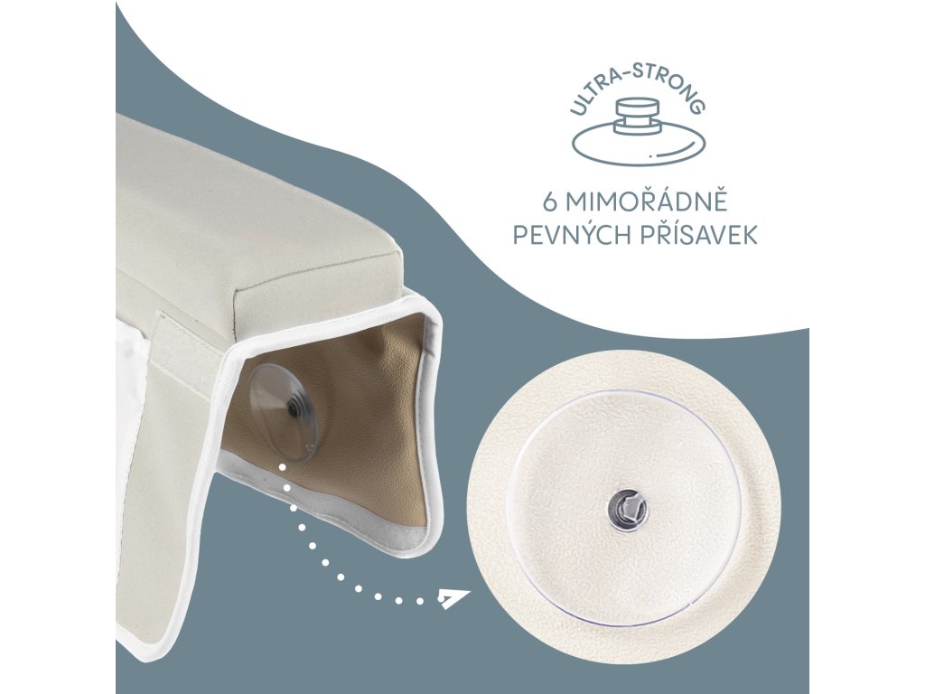 Podložka je vybavena šesti silnými přísavkami, které zajišťují, že zůstane bezpečně na místě. Boční panely se snadno přizpůsobí i vanám s kolejnicemi sprchových dveří. Čtyři praktické kapsy navíc poskytují prostor pro uložení mýdel, šamponů či dalších koupelnových doplňků, aby bylo vše potřebné vždy po ruce.