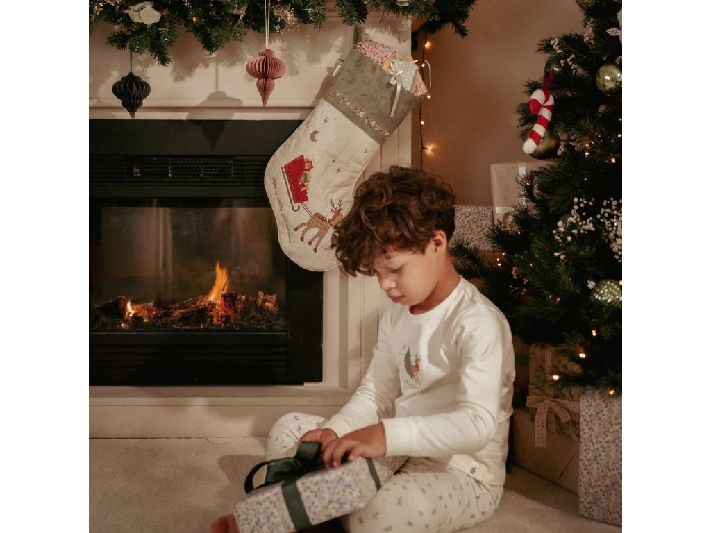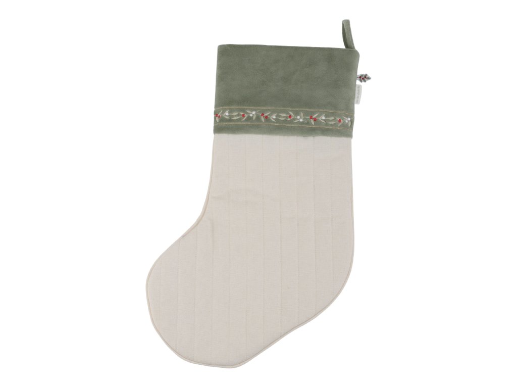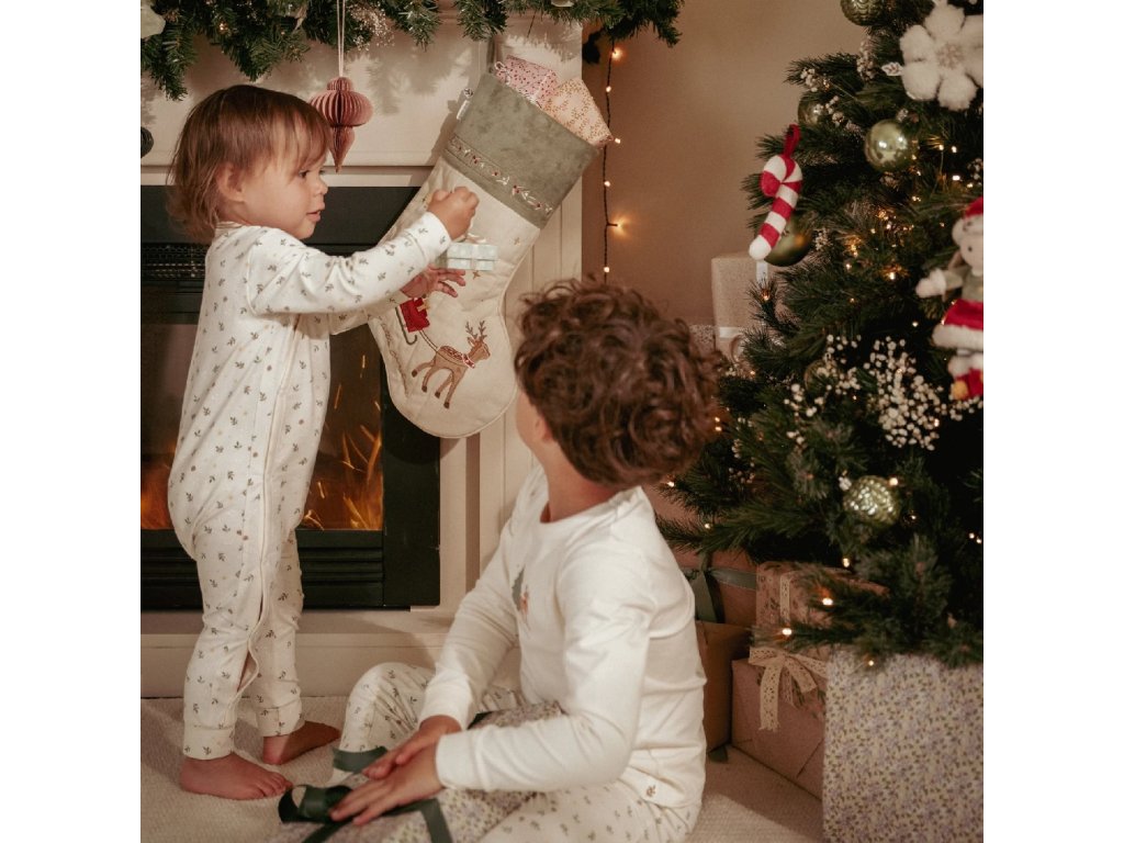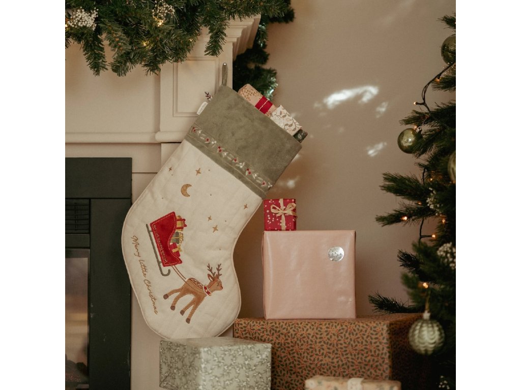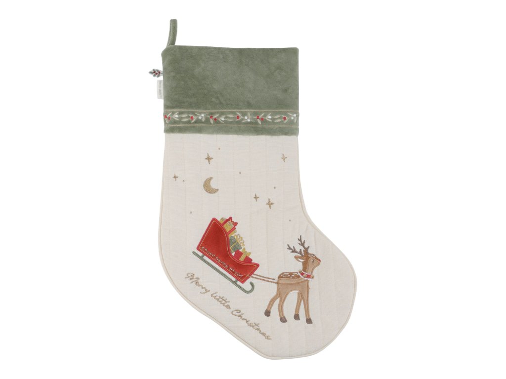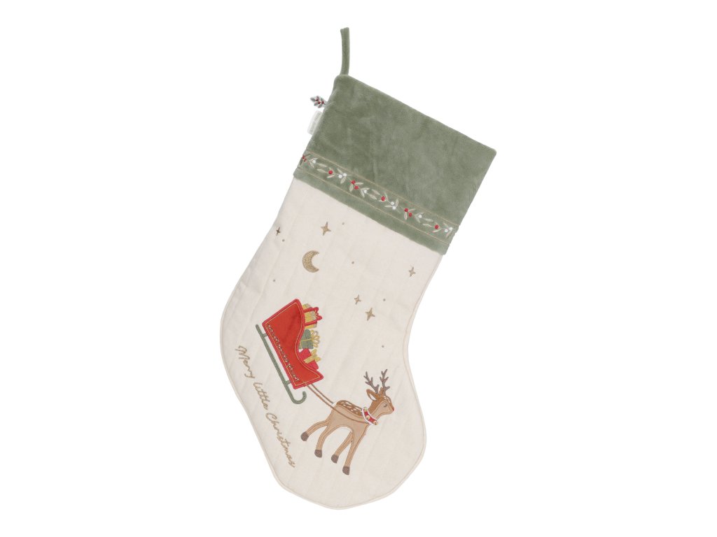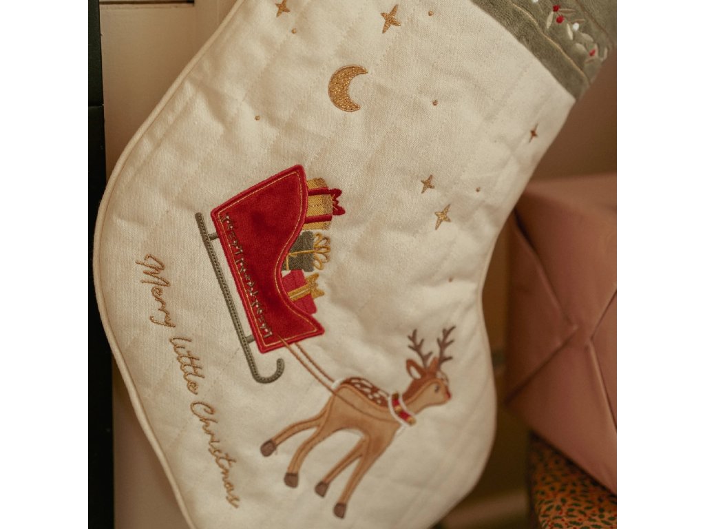 Vneste do svého domova teplo a kouzlo Vánoc s touto krásnou vánoční punčochou z měkké, prošívané látky. Je ozdobena jemnou výšivkou s motivem soba, saní s dárky a třpytivých hvězd. Díky svému nadčasovému designu v přírodních barvách skvěle ladí s klidnou a tradiční vánoční výzdobou. Punčochu lze zavěsit na krb, dveře či postel a naplnit drobnými dárky, sladkostmi nebo vzkazy pro blízké. Každý rok se tak stane oblíbenou součástí rodinných Vánoc. Punčocha je součástí speciální vánoční kolekce doplňků a hraček Little Dutch. Rozměry: 52,5 × 29 cm Složení: 95 % bavlna, 5 % polyester; výplň: 100 % polyesterDoplňkové parametry