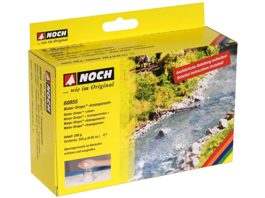 Water-Drops® transparent jsou pro modelová vodní díla jako stvořené! Materiál ve formě granulí se dobře zpracovává a je ideální pro vytváření stojatých i tekoucích vodních ploch v modelové krajině. Jeho hlavní výhody spočívají v jednoduchém zpracování a možnosti opětovného nahřátí po vytvrzení, například pomocí silného fénu. Díky tomu lze dodatečně modelovat vlny nebo odstranit drobné škrábance z vodní hladiny. Water-Drops® jsou dostupné ve variantách transparent, easy a color. Přednosti varianty Water-Drops® transparent je snadné použití, rychlé zpracování díky krátké době tuhnutí, možnost obarvení, úpravy povrchu pomocí tepla i po vytvrzení. Skvěle se hodí pro tvorbu křišťálově čistých jezer, řek a potoků. Pro barevné ztvárnění dna se doporučuje použít sadu vodních barev. Upozornění: nebezpečí popálení – používejte ochranné rukavice! Neohřívat v mikrovlnné troubě. Výhradně pro dospělé modeláře. Hlavní vlastnosti: jedná se o model, nejedná se o hračkuvhodné od 18 letměřítko H0, TT, N, Z, 0, 1, G, H0m, H0eSizing info