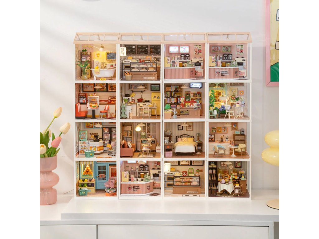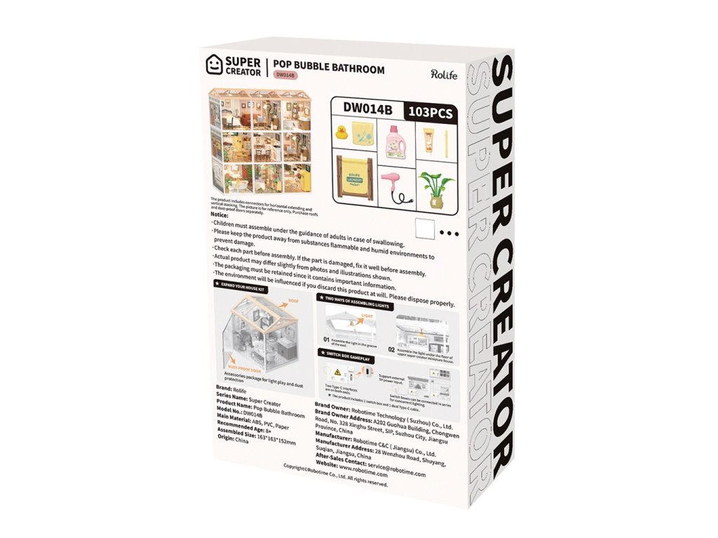 Představte si, jak si po náročném dni plném práce napustíte horkou vanu, připravíte si voňavou pěnivou koupel a užíváte si pocit pohody a uvolnění. Koupelna v kombinaci pastelově růžové a bílé barvy s vanou se zlatými nožičkami, toaletou s „usmívajícím se“ víkem a dalšími stylovými doplňky je kompletně vybavená všemi potřebnými drobnostmi, jako je fén, ručníky, bačkůrky a další nezbytnosti, např. roztomilá žlutá kachnička, noviny ke čtení i potřeby pro praní. Spojením různých miniatur řady Super Creator Series vertikálně nebo horizontálně můžete vytvořit různorodý komplex domečků. Ochraňte svůj výtvor pomocí krytů proti prachu a nečistotám – DWP05 Dveře proti prachu B a DWP02 Střecha typu B. Skládání skládačky podporuje rozvoj jemné motoriky, prostorového myšlení a trpělivosti. Je to možnost, jak kombinovat zábavu se vzděláváním. Všechny přesné dílky do sebe lehce zapadnou, aby výsledek byl stabilní a odolný, a to bez použití lepidla. Skládačka je dodávána v nesloženém stavu, zabalená v krabici s podrobným návodem k sestavení. Hlavní vlastnosti: 103 dílkůdoba skládání 45 minLED osvětleník napájení slouží kabel USB-C (je součástí balení)sestavení bez použití lepidlavýjimečný vzhledvhodné pro děti i dospělérozvíjí logické a motorické dovednostipodporuje trpělivost dětíideální jako dárek nebo jedinečná dekoracemožnost spojení více miniaturk dokoupení kryty proti prachu – DWP05 a DWP02Sizing info