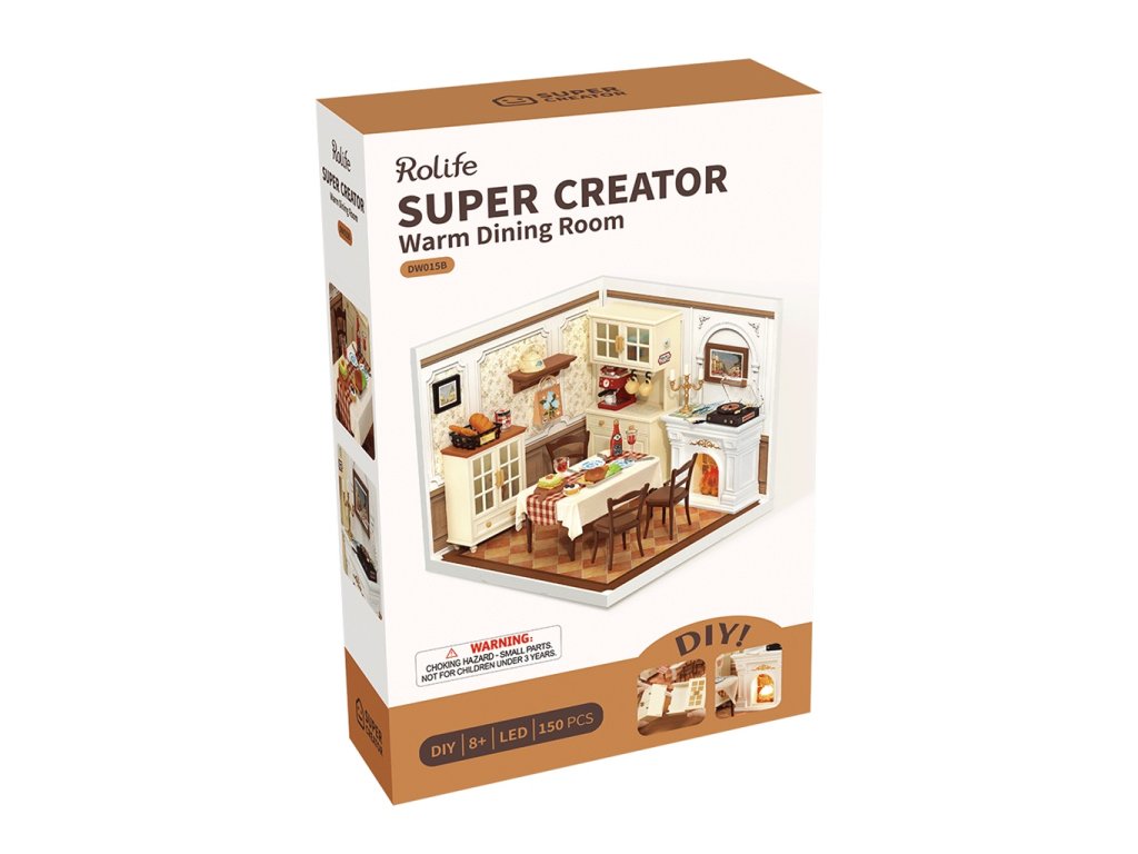 Kuchyň a jídelna jsou srdcem domova. U jídelního stolu se potkáváme se svými nejbližšími a u jídla si povídáme o životě, novinkách, svých zážitcích. Den začínáme šálkem kávy nebo čaje a snídaní a u jídelního stolu v kruhu rodiny náš den končí. Tento útulný jídelní kout v elegantním vintage stylu v krémové barvě s prostorným jídelním stolem je zobrazen do nejmenších detailů. Najdete zde příborník, stůl pokrytý ubrusem se 4 židlemi, pečivo, talířky, hrnečky, kávovar a další doplňky, které navozují atmosféru klidu a rodinné pohody, jako jsou obrázky na zdech, svícen či gramofon. Spojením různých miniatur řady Super Creator Series vertikálně nebo horizontálně můžete vytvořit různorodý komplex domečků. Ochraňte svůj výtvor pomocí krytů proti prachu a nečistotám – DWP05 Dveře proti prachu B a DWP02 Střecha typu B. Skládání skládačky podporuje rozvoj jemné motoriky, prostorového myšlení a trpělivosti. Je to možnost, jak kombinovat zábavu se vzděláváním. Všechny přesné dílky do sebe lehce zapadnou, aby výsledek byl stabilní a odolný, a to bez použití lepidla. Skládačka je dodávána v nesloženém stavu, zabalená v krabici s podrobným návodem k sestavení. Hlavní vlastnosti: 150 dílkůdoba skládání 45 minLED osvětleník napájení slouží kabel USB-C (je součástí balení)sestavení bez použití lepidlaatraktivní vzhledvhodné pro děti i dospělérozvíjí logické a motorické dovednostipodporuje trpělivost dětíideální jako dárek nebo jedinečná dekoracemožnost spojení více miniaturk dokoupení kryty proti prachu – DWP05 a DWP02Sizing info