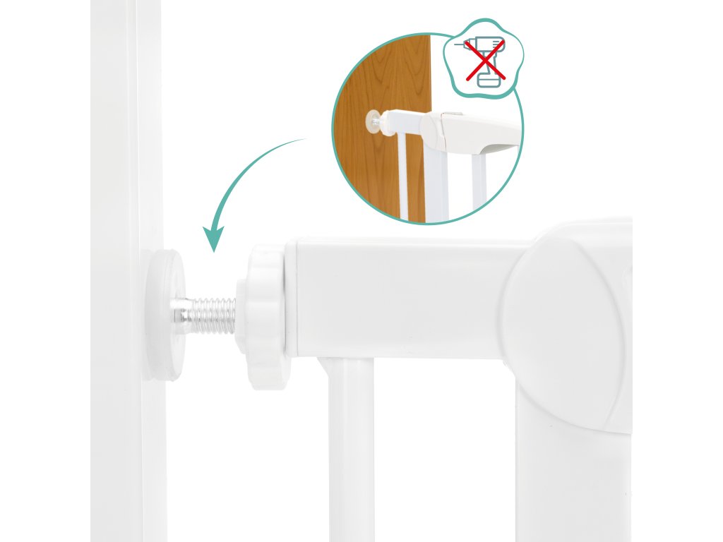 Dveřní zábrana se velmi snadno instaluje a nevyžaduje žádné vrtání, takže je ideální do pronajatých bytů nebo domů, kde chcete ponechat stěny neporušené. Pro širší dveřní rámy jsou k dispozici volitelné nástavce a speciální nástavce pro zábradlí, které umožňují flexibilní přizpůsobení téměř jakékoli šířce dveří.
