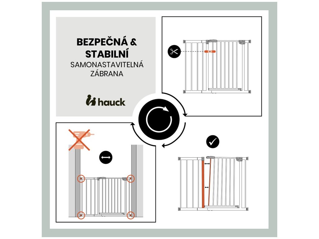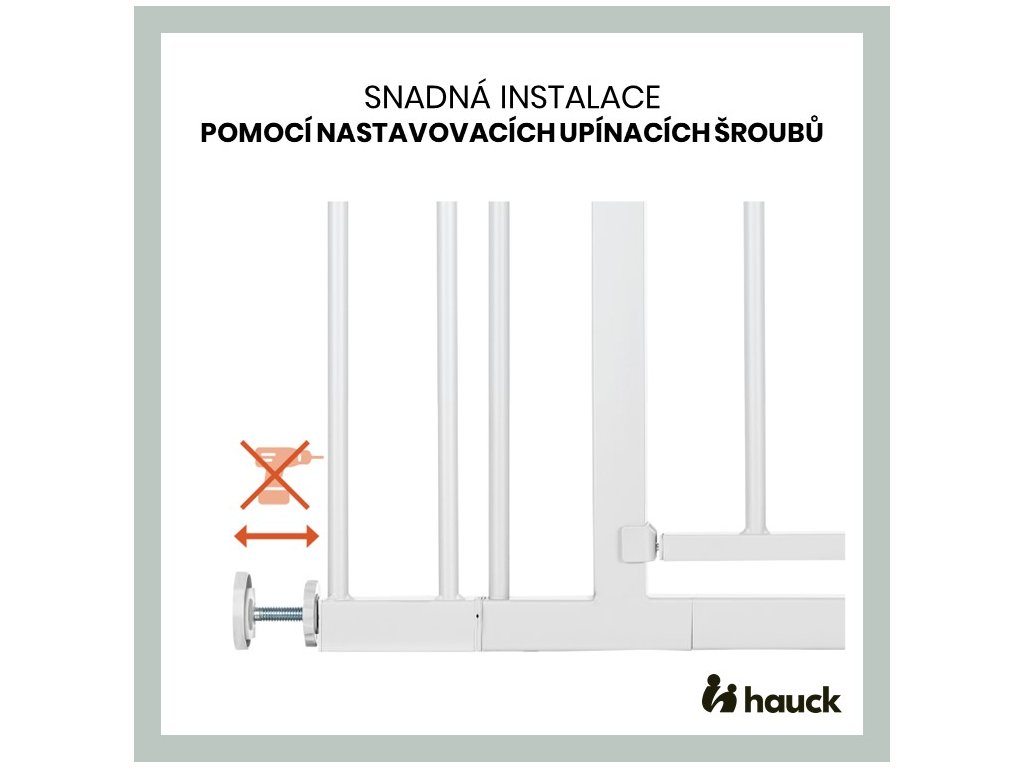 Ať už doma, u prarodičů nebo na dovolené - díky přítlačnému upevnění s nastavovacími šrouby lze dětskou branku snadno namontovat a demontovat v několika jednoduchých krocích.