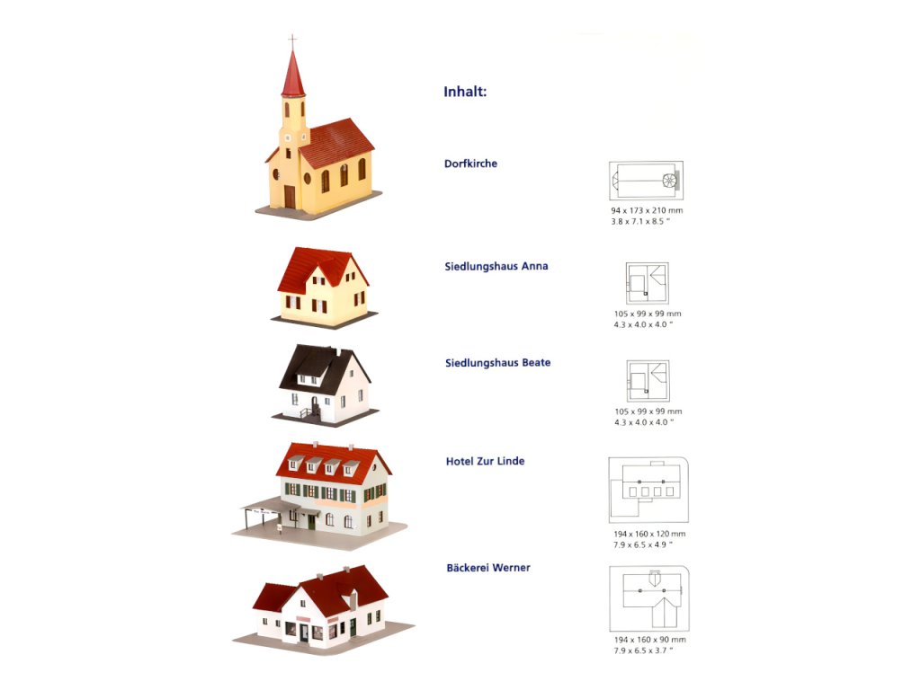 Video je pouze ilustrační, zobrazuje příbuzný produkt. Výhodná souprava pěti staveb ze série modelů PIKO HOBBY, kterou vytvoříte základ libovolné vesnice, či městečka. Ostatní předměty zachycené na obrázku (auta, figurky atd.) nejsou součástí dodávky. Plastikové miniatury PIKO naleznou uplatnění při návrzích realistických kolejišť a dioramat. Propracovanou barevností napodobují své předlohy s maximální věrností. Detailní a přesné plastové výlisky jednotlivých dílů do sebe hladce zapadají a díky detailnímu návodu přiloženému ke každé stavebnici je sestavení snadné, můžete tak svůj cenný čas věnovat jedinečnému návrhu krajiny a rozložení jednotlivých prvků na scéně. Mezi příslušenstvím nabízeným k těmto modelům naleznete rozmanité doplňky, spotřební materiál i průvodce s návody a cennými radami pro návrhy kolejišť. Hlavní vlastnosti:5 staveb (kostel, penzion, obchod a 2 rodinné domy)měřítko H0 (1:87)realistické barvysnadné sestavení Dokumentace:návod k sestavení modelu č. 61925Sizing info