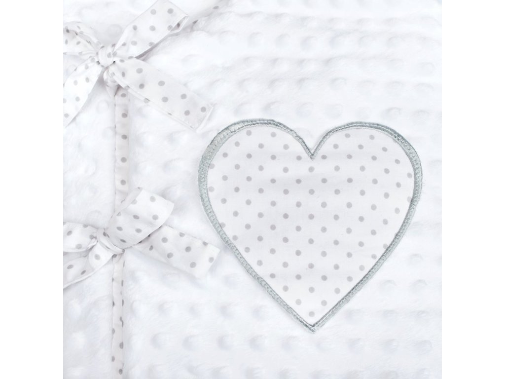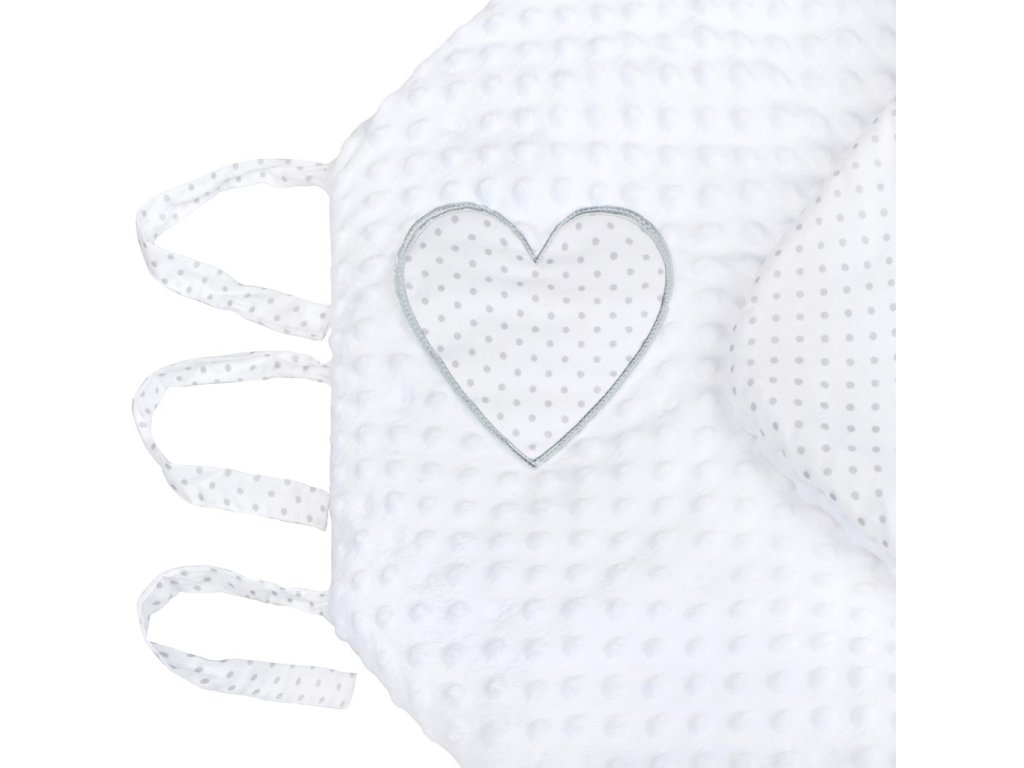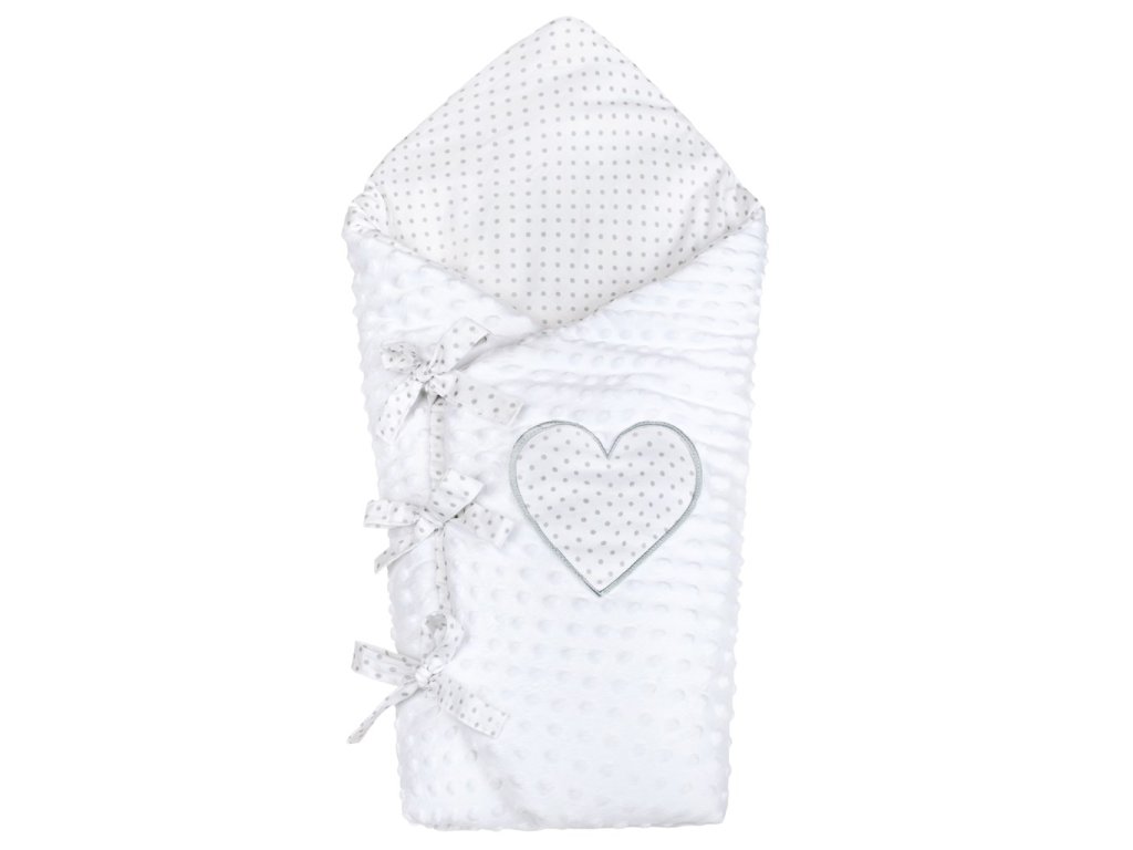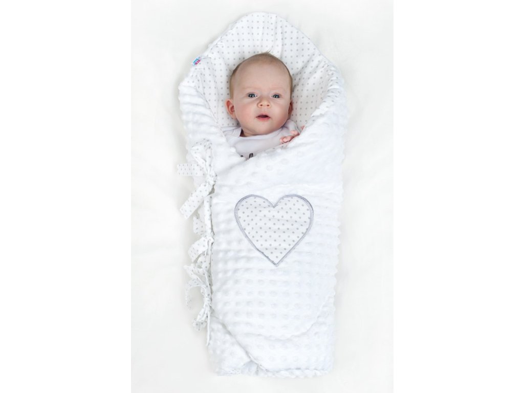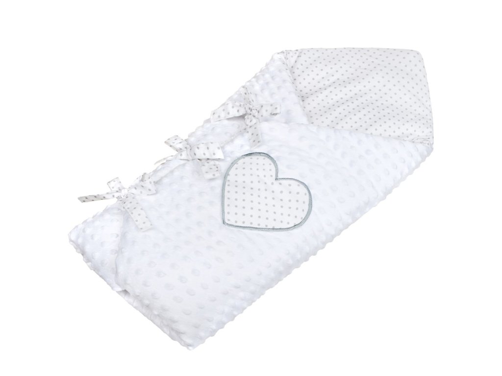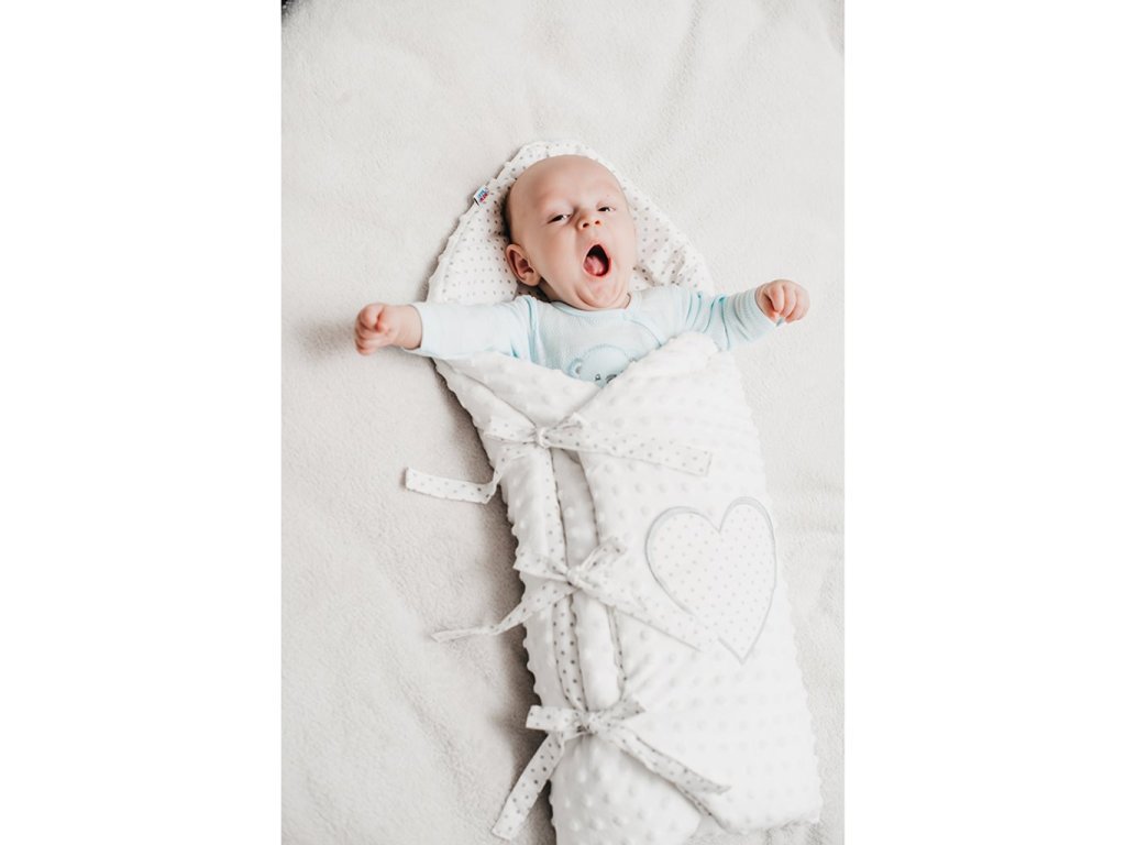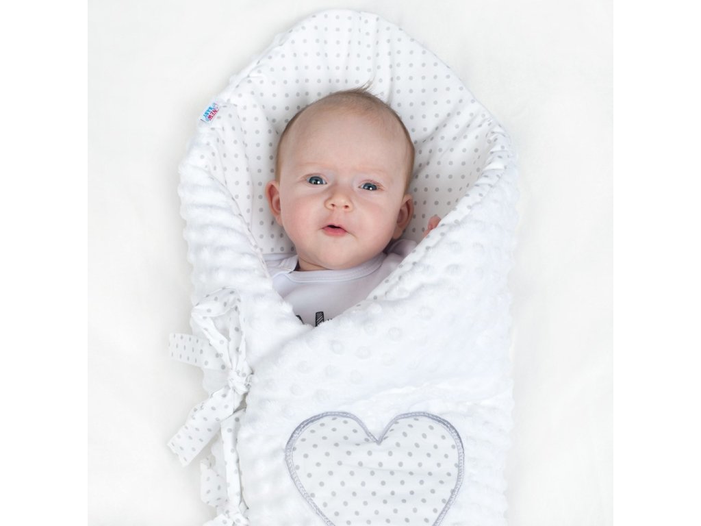Luxusní šněrovací zavinovačka z Minky New Baby. Zavinovačka je vyrobena ze dvou typů tkanin a je zdobena krásným vyšívaným srdíčkem a šedým puntíkovaným bavlněným podkladem. První je velmi měkká a na dotek příjemná, hebká Minky látka s výstupky pro stimulaci senzomotoriky a druhou je 100% bavlna. Zavinovačka se zavazuje na tři řady stuh, které Vaše miminko pevně zavinou.