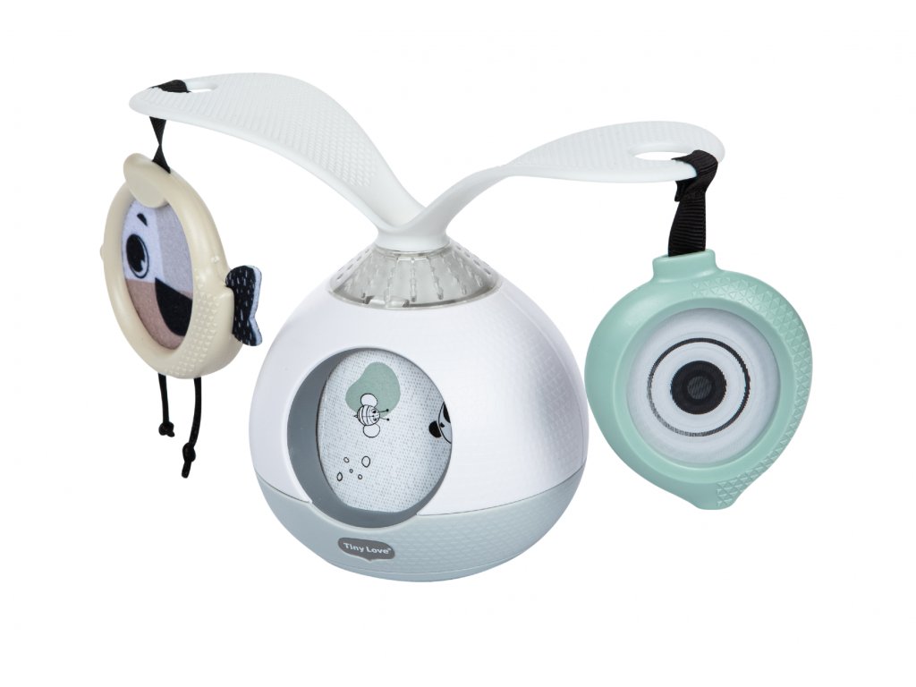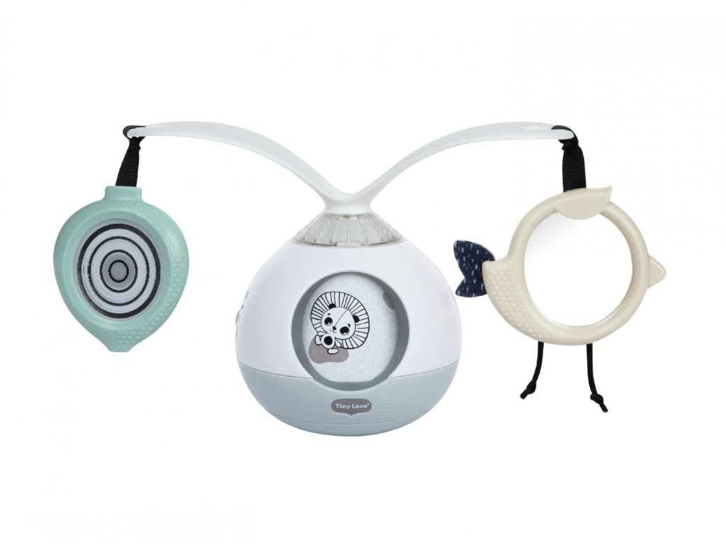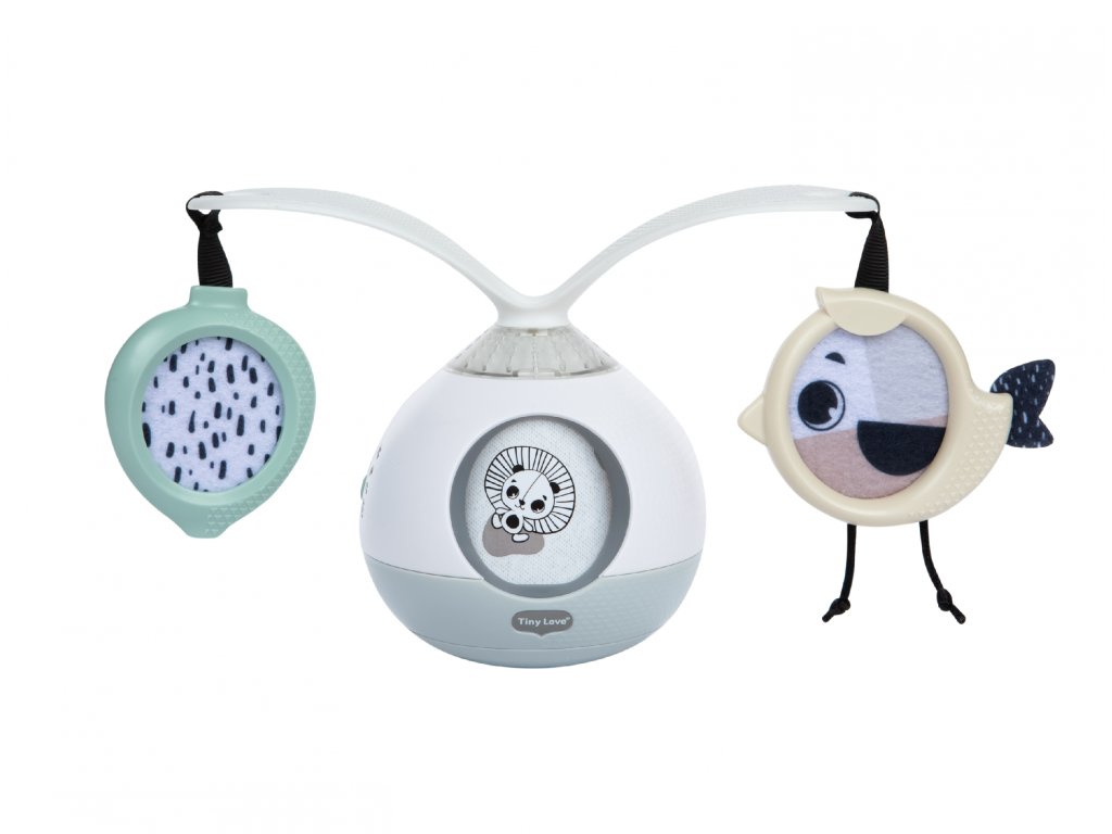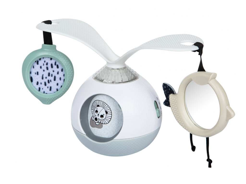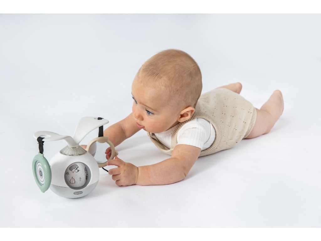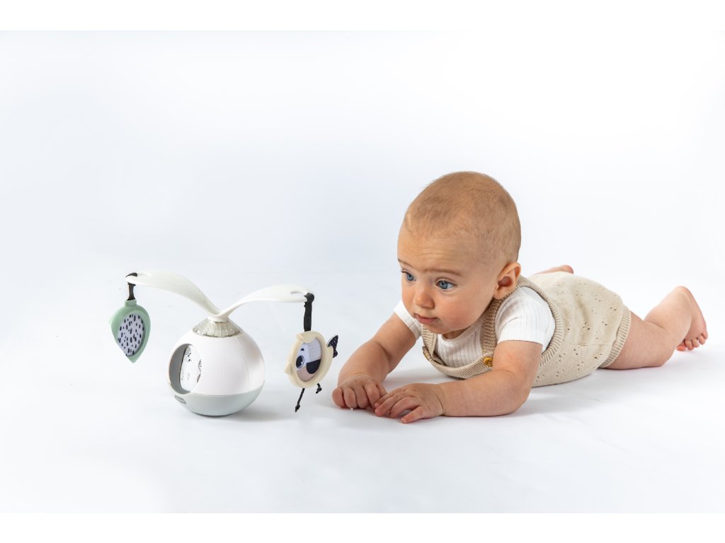 Unikátní hudební box s hudbou, světýlky a otočnými rameny podněcuje dítě ke hře na bříšku. Pro malého kojence, který tráví většinu dne i noci ležením na zádech, je důležité, aby trávil několikrát denně čas ležením na bříšku a takzvaným “pasením koníčků”. Poloha na bříšku přináší děťátku jiný pohled na svět a posiluje krční a zádové svaly, které později umožňují dítěti začít se přetáčet, lézt a sedět bez opory. Hudební box nabízí dítěti aktivity, které ho udrží déle spokojené v poloze na bříšku. Na ramenou, otáčejících se o 360°, upoutá pozornost dítěte zavěšené zrcátko i výrazné hologramové obrázky. Obrázky zvířátek se pohybují i v okénku hudebního boxu. Hračka umožňuje nastavit automatické přehrávání až 30 minut melodií spolu se světýlky. Další variantou je pouštění hudby a světýlek dotykem, dítě se tak učí příčině a následku. Hračku je možné používat i bez hudby. Kromě postavení hračky na zem pro hru na bříšku je možné ji s pomocí klipu zavěsit např. na kočárek. Rozměry: 18,8 x 9,6 x 13,3 cm Baterie 3xAA 1,5V nejsou součástí balení. Vhodné pro děti od narození.Doplňkové parametry