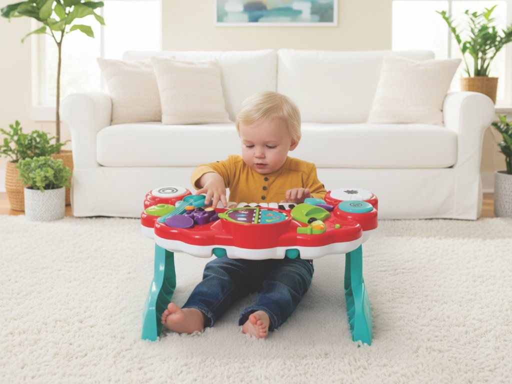 Hudební pult Infantino 10v1 dětem přibližuje hudbu už od raného věku. Pult nabízí 10 různých hudebních nástrojů včetně kláves s velkými tlačítky pro snadné hraní malými dětskými prstíky. Součástí je také oboustranný „zpěvník“, který po otočení automaticky přehrává různé veselé skladby a rozšiřuje možnosti hraní. Pult přehrává více než 25 melodií a zvukových efektů. Hudební pult je ideální pro rozvoj hudebního cítění, koordinace a kreativity. Rozměry: 57,5 × 14,4 × 35,6 cm Vyměnitelné baterie 2xAA 1,5V součástí výrobku. Vhodné pro děti od 12 do 36 měsíců.Doplňkové parametry